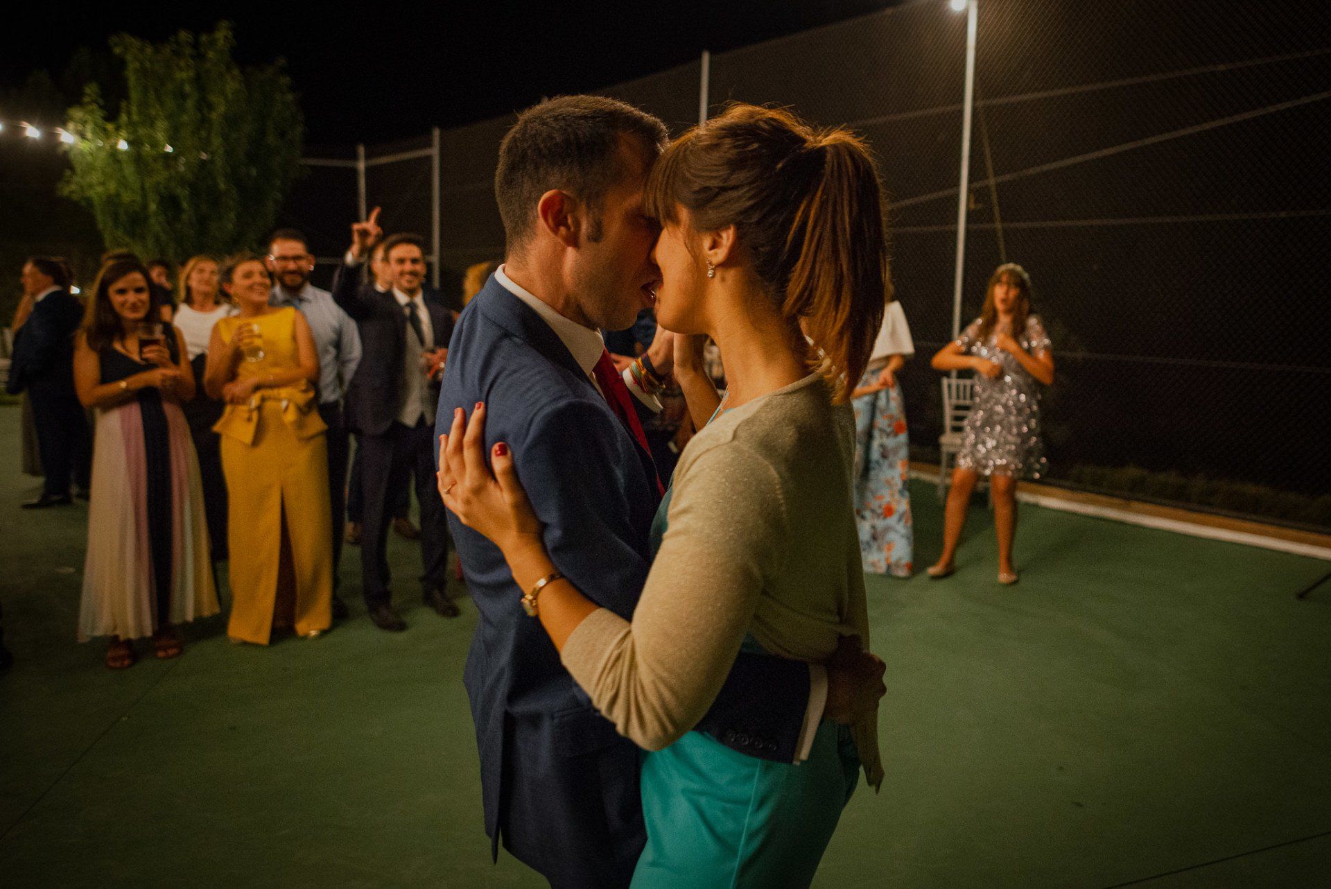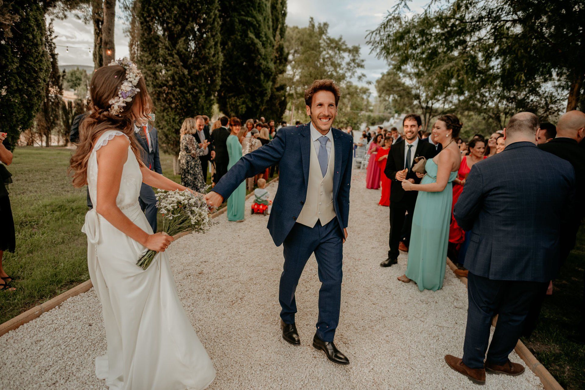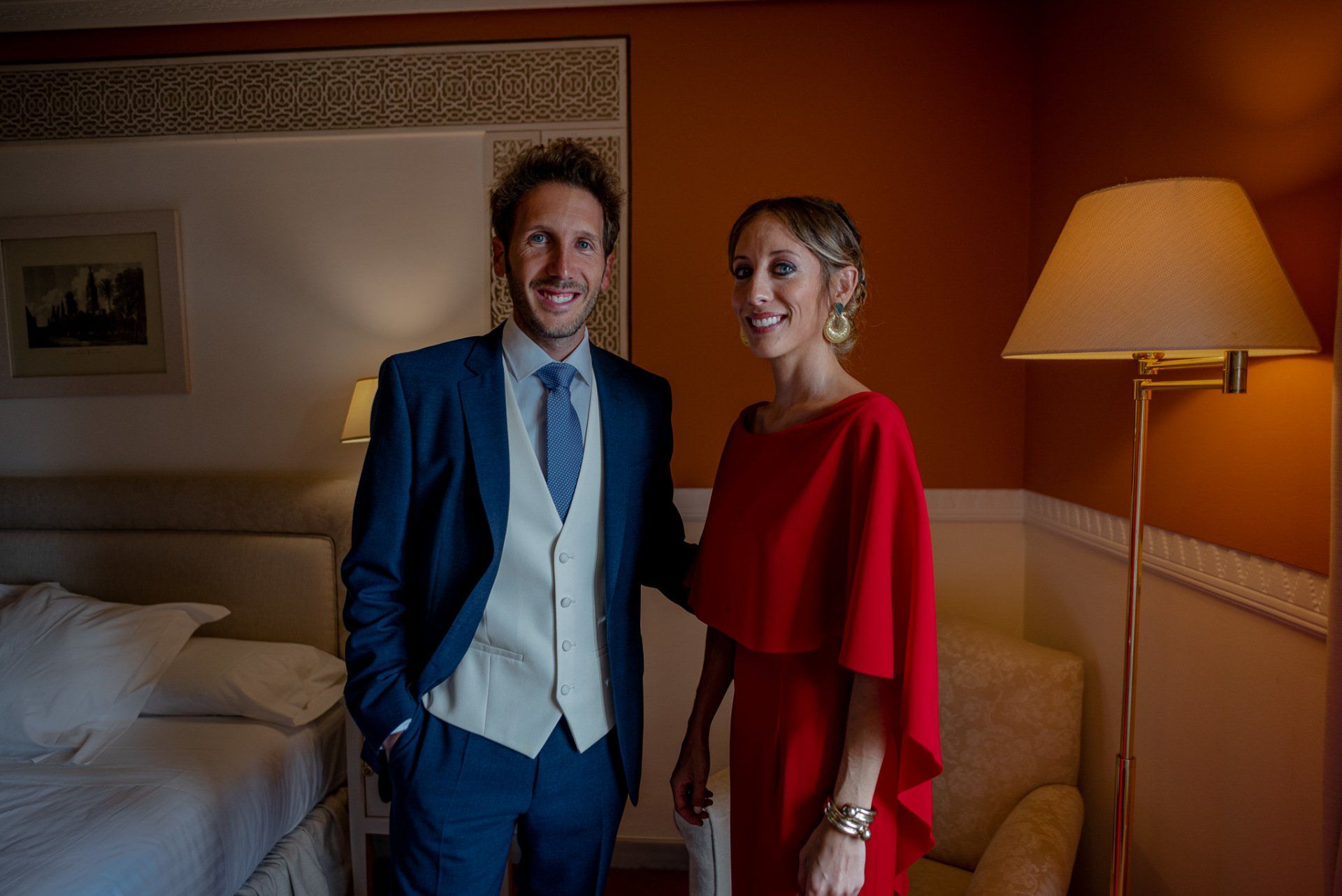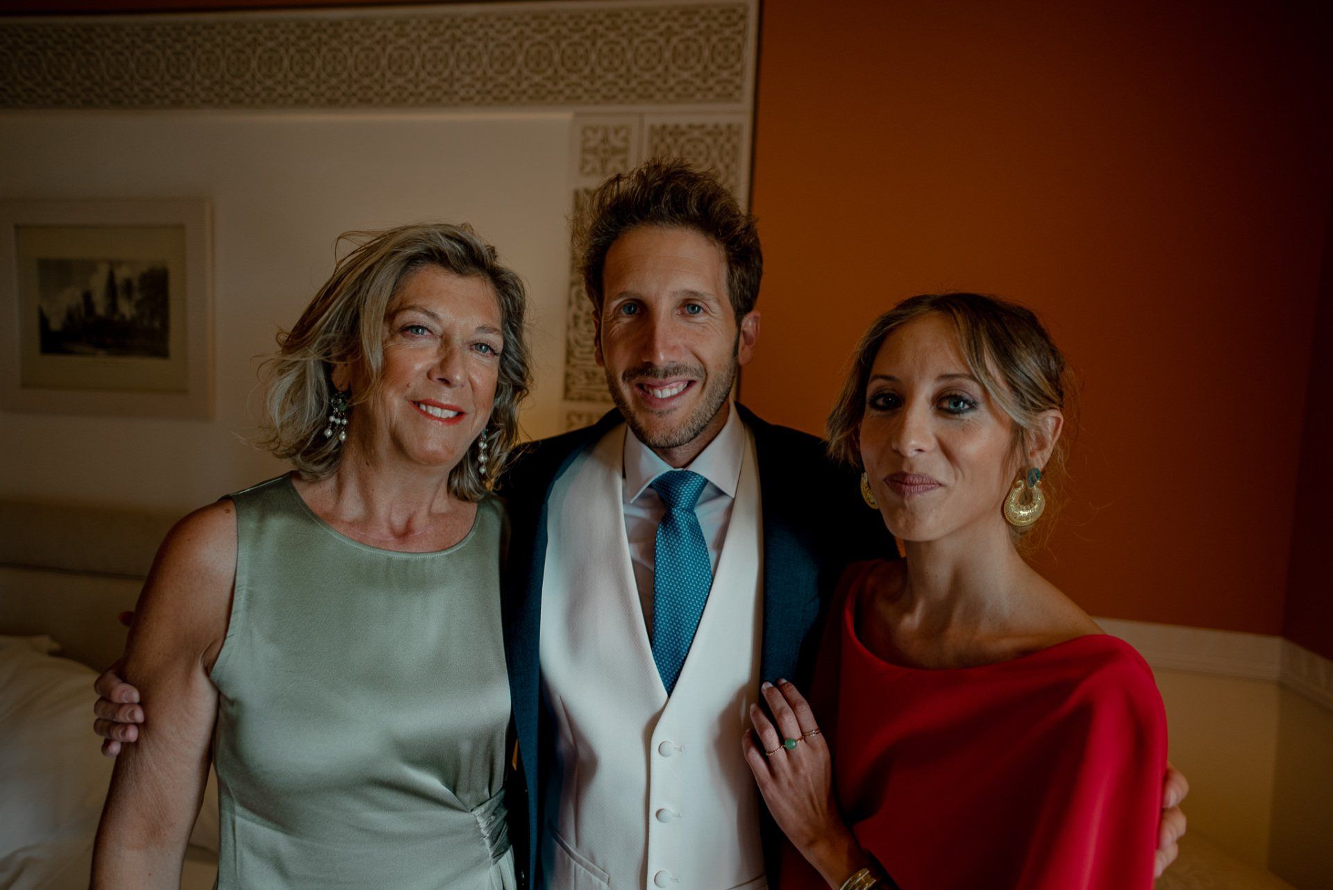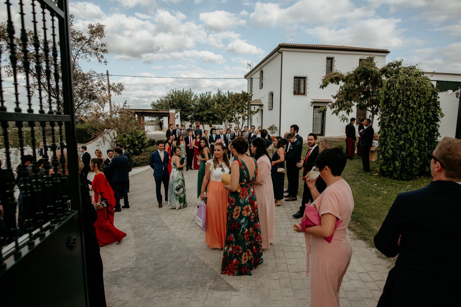 Álex und Elena reisten mit einem großen Gefolge aus Familie und Freunden aus Mallorca an, um ihre Hochzeit in Granada zu feiern. Obwohl ich nicht viel recherchierte, gab mir der Anblick einer asturischen Flagge auf der Schutzfolie des Mobiltelefons von Alex‘ Vater einen Hinweis auf deren Herkunft. Die Hochzeit fand auf der Farm von Elenas Familie in der Stadt Láchar in Granada statt. Ein andalusisches Anwesen mit zwei Hauptgebäuden mit Einfamilienhäusern, einem Waldgebiet, in dem die Zeremonie stattfand, und einem alten Tennisplatz, auf dem der Bankett- und Tanzbereich eingerichtet war. Wir beginnen am Alhambra Palace Hotel, an einem ganz besonderen Ort neben dem berühmtesten Denkmal und mit beneidenswertem Blick auf die Stadt. Elena zog sich auf dem Bauernhof Láchar an, wo sie auf Álex‘ Familie wartete. Die meisten Gäste, die von außerhalb kamen, hauptsächlich aus Mallorca und in der Stadt übernachteten, kamen in zwei Bussen an, die das Anwesen in einem Moment füllten. Die hochemotionale Zeremonie unter den Laubbäumen und geschützt vor Sonne und Hitze Ende Juli war eine Sammlung von Geschichten über das Paar in seinen Anfängen, den Anfängen seiner Beziehung, seinen Erasmus-Erlebnissen, seinen Reisen, seinen Jobs ... erzählt von den Menschen, die sie am besten kennen: Brüder und Abenteuerfreunde. Das spektakuläre Bankett und die Party im Tennisplatzbereich, zwischen den Herausforderungen und Streichen der zahlreichen Freunde. Es war beängstigend, als wir die Mädchen auf der einen und die Jungen auf der anderen Seite zum Fotografieren versammelten ... es konnte alles passieren. Wir waren so viele Stunden dort, dass wir keine Lust mehr hatten, von seiner Seite zu weichen.