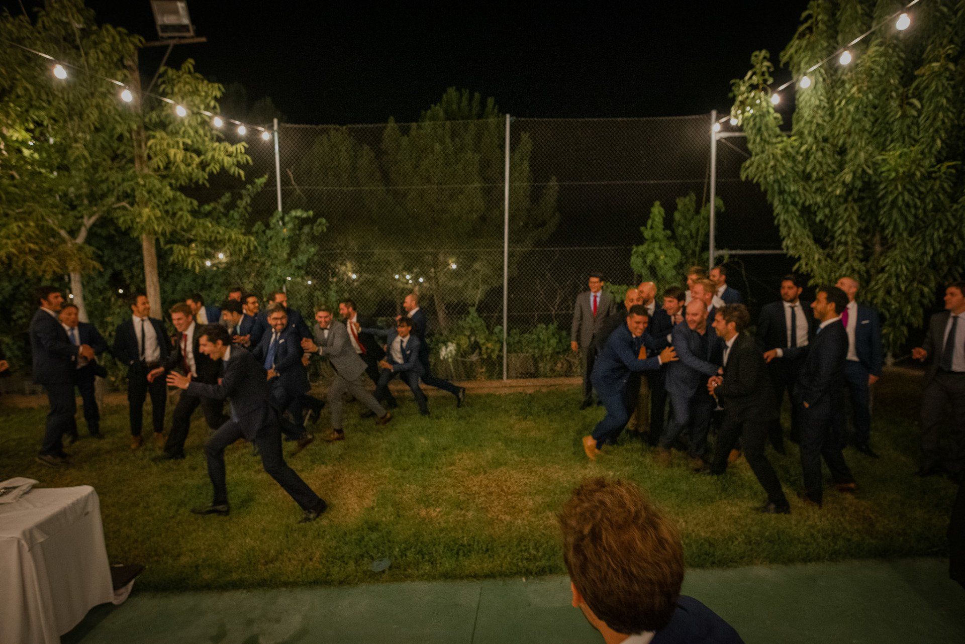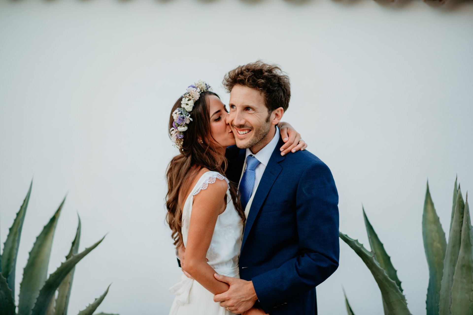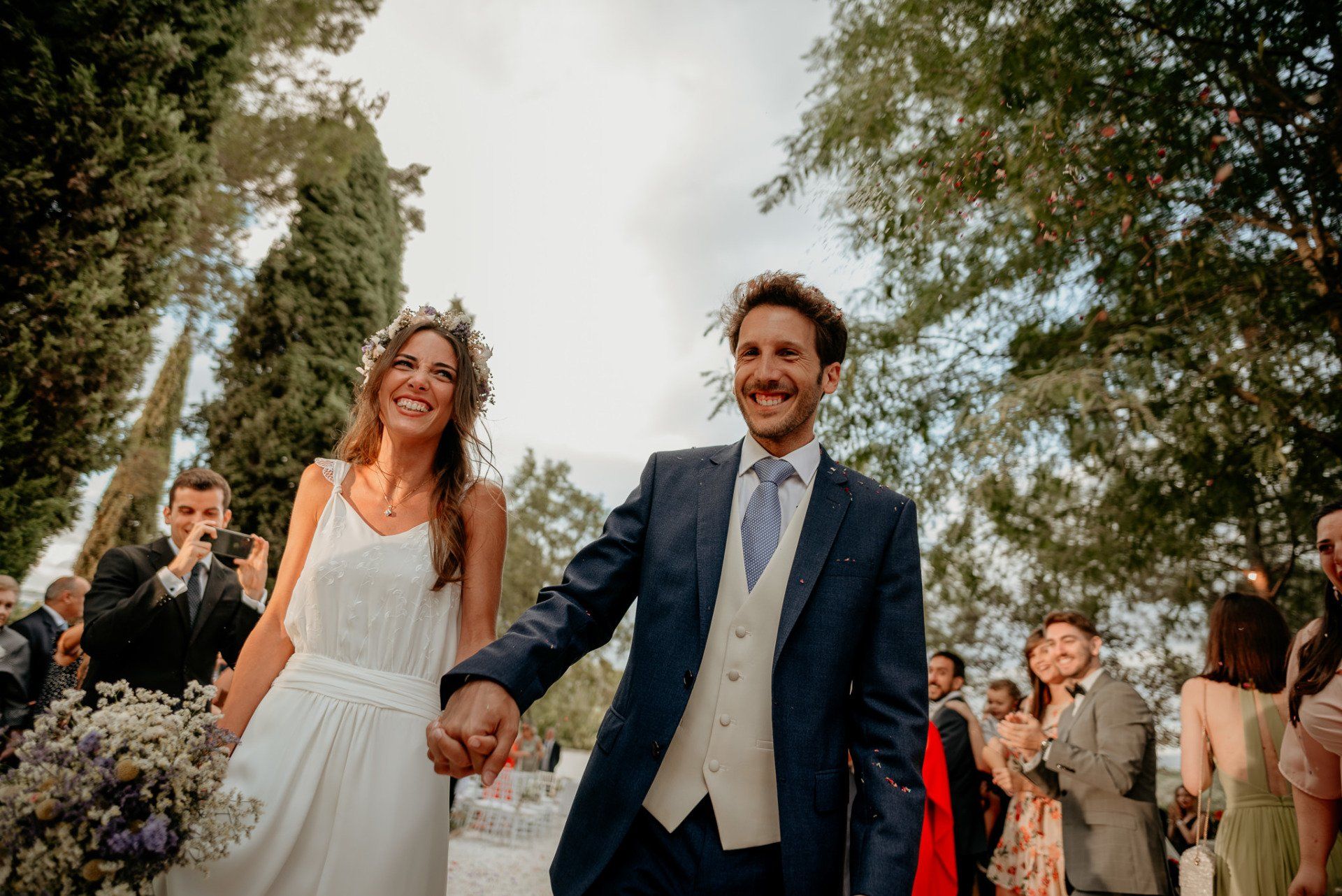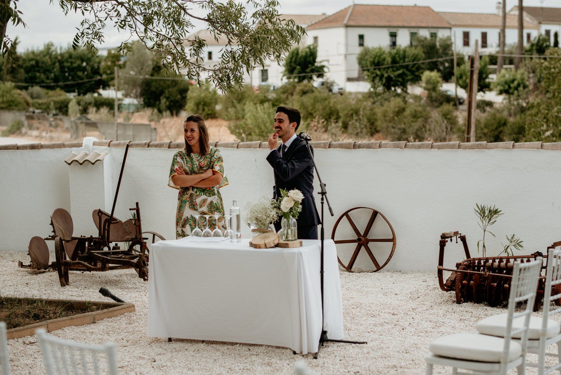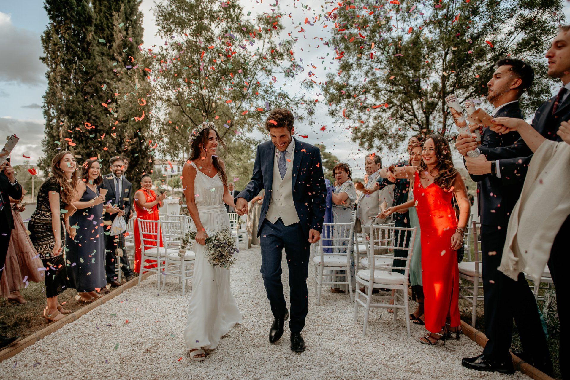 Álex und Elena reisten mit einem großen Gefolge aus Familie und Freunden aus Mallorca an, um ihre Hochzeit in Granada zu feiern. Obwohl ich nicht viel recherchierte, gab mir der Anblick einer asturischen Flagge auf der Schutzfolie des Mobiltelefons von Alex‘ Vater einen Hinweis auf deren Herkunft. Die Hochzeit fand auf der Farm von Elenas Familie in der Stadt Láchar in Granada statt. Ein andalusisches Anwesen mit zwei Hauptgebäuden mit Einfamilienhäusern, einem Waldgebiet, in dem die Zeremonie stattfand, und einem alten Tennisplatz, auf dem der Bankett- und Tanzbereich eingerichtet war. Wir beginnen am Alhambra Palace Hotel, an einem ganz besonderen Ort neben dem berühmtesten Denkmal und mit beneidenswertem Blick auf die Stadt. Elena zog sich auf dem Bauernhof Láchar an, wo sie auf Álex‘ Familie wartete. Die meisten Gäste, die von außerhalb kamen, hauptsächlich aus Mallorca und in der Stadt übernachteten, kamen in zwei Bussen an, die das Anwesen in einem Moment füllten. Die hochemotionale Zeremonie unter den Laubbäumen und geschützt vor Sonne und Hitze Ende Juli war eine Sammlung von Geschichten über das Paar in seinen Anfängen, den Anfängen seiner Beziehung, seinen Erasmus-Erlebnissen, seinen Reisen, seinen Jobs ... erzählt von den Menschen, die sie am besten kennen: Brüder und Abenteuerfreunde. Das spektakuläre Bankett und die Party im Tennisplatzbereich, zwischen den Herausforderungen und Streichen der zahlreichen Freunde. Es war beängstigend, als wir die Mädchen auf der einen und die Jungen auf der anderen Seite zum Fotografieren versammelten ... es konnte alles passieren. Wir waren so viele Stunden dort, dass wir keine Lust mehr hatten, von seiner Seite zu weichen.