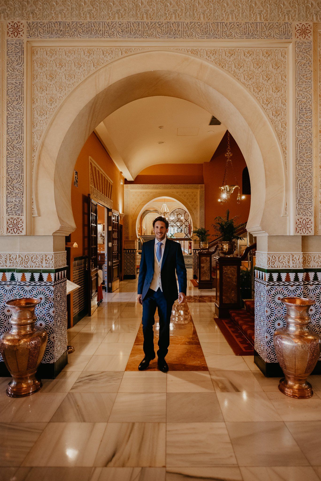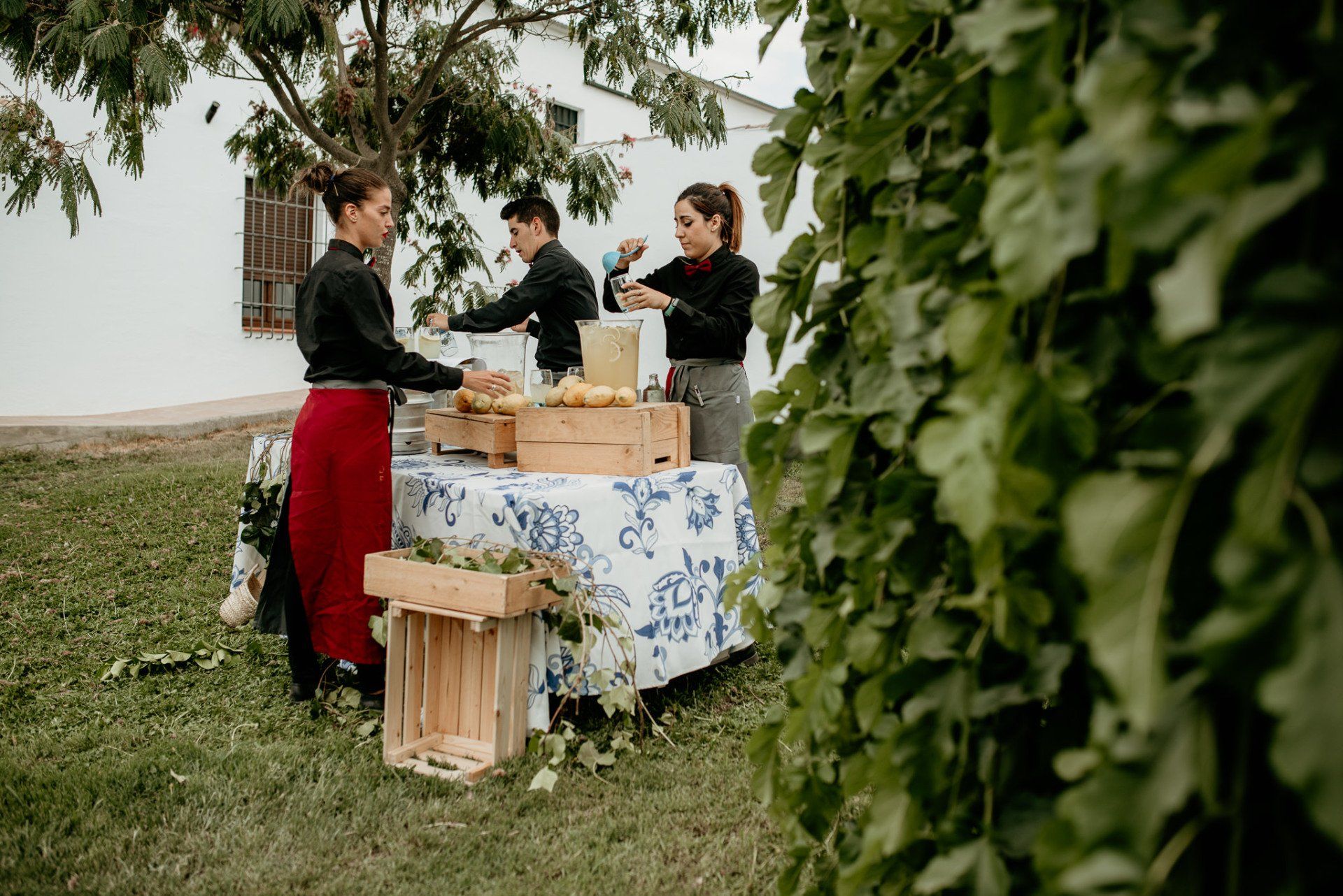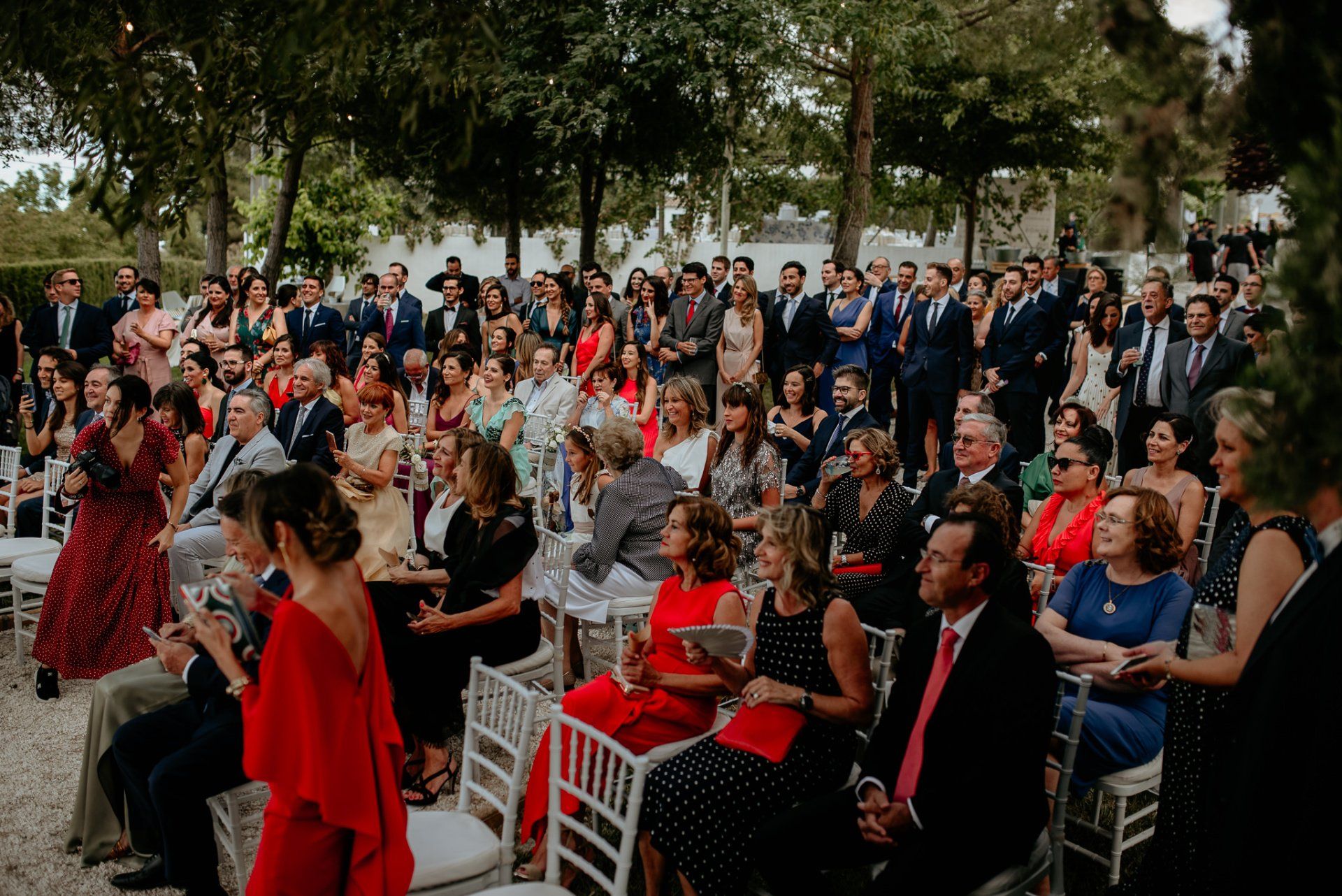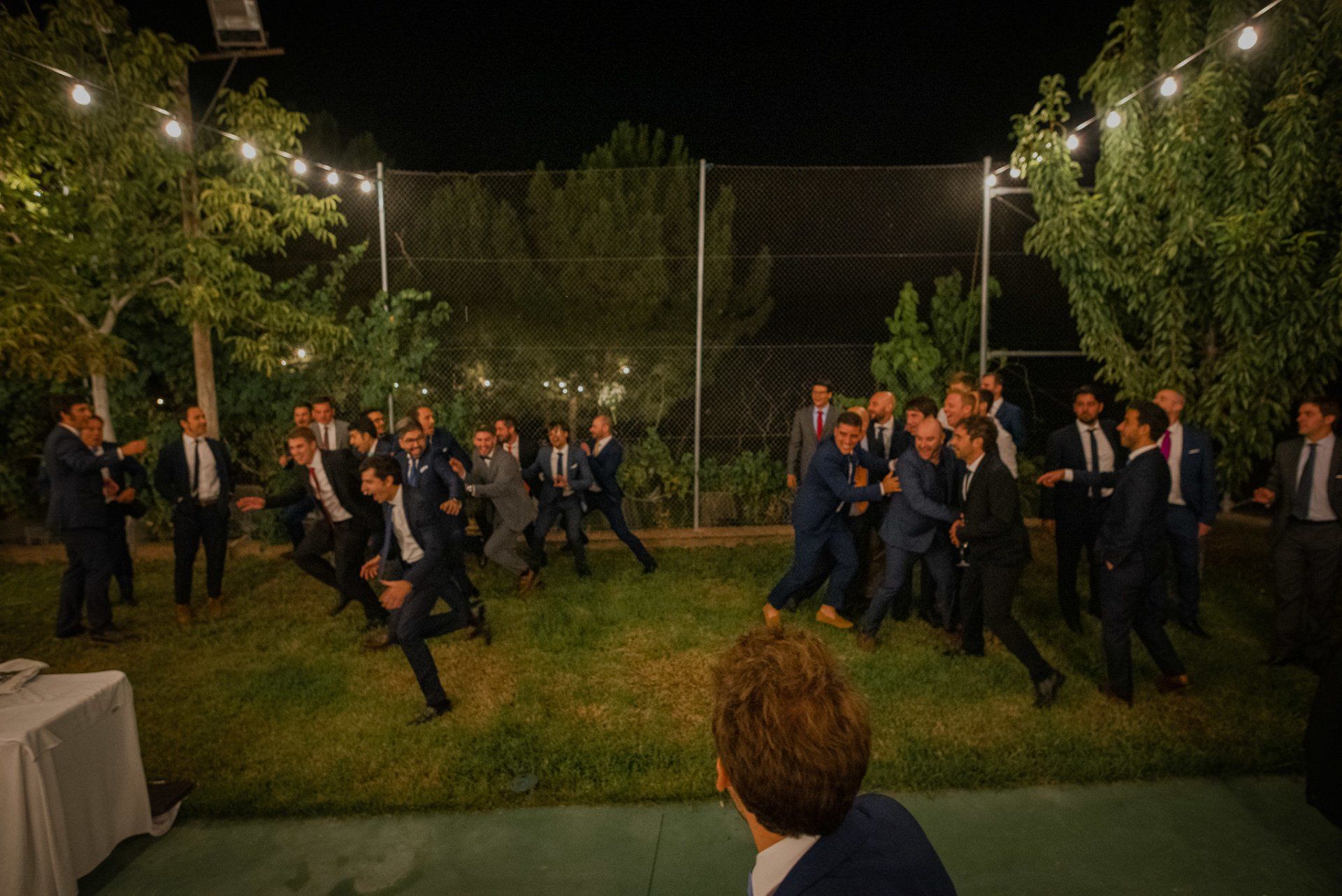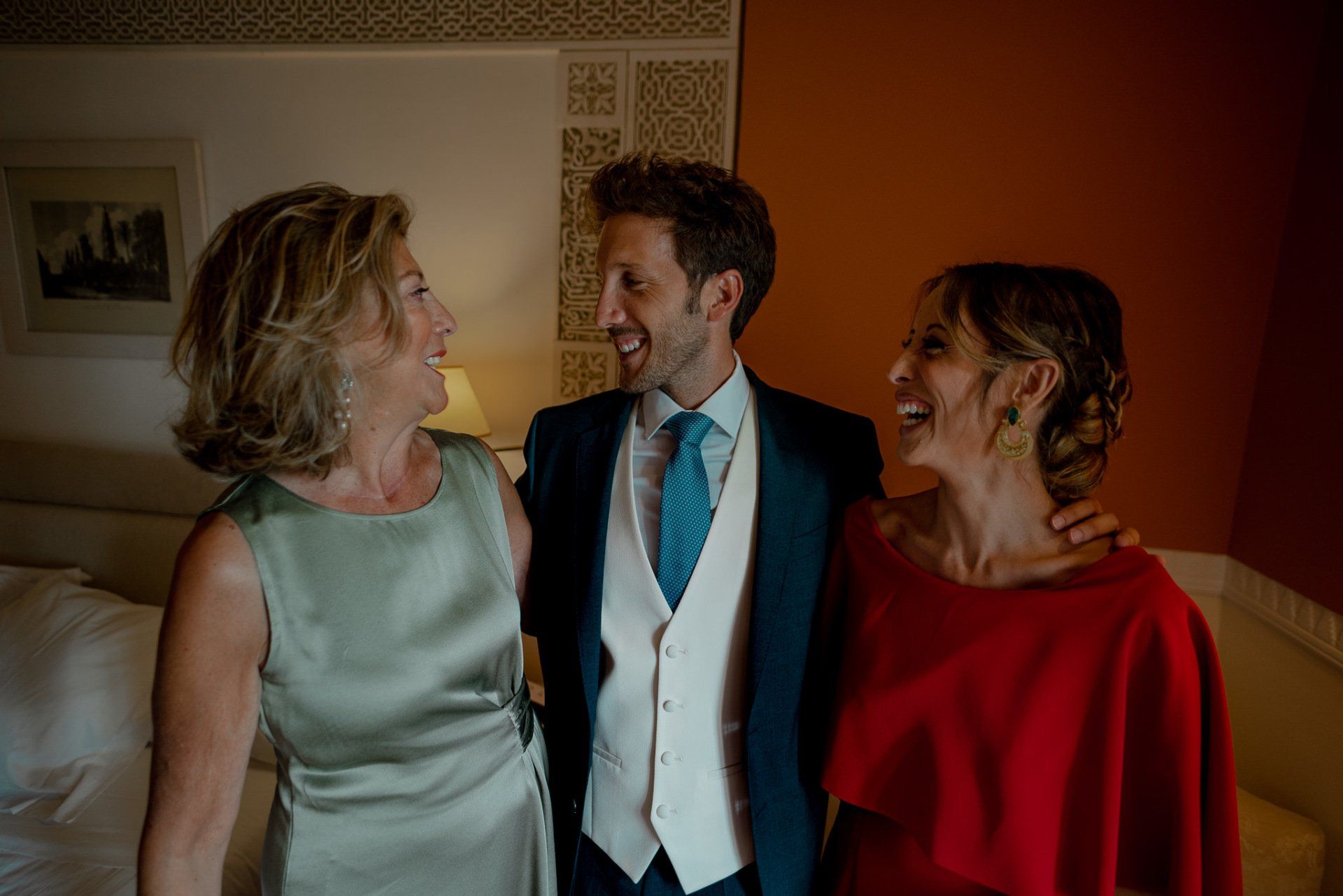 Álex und Elena reisten mit einem großen Gefolge aus Familie und Freunden aus Mallorca an, um ihre Hochzeit in Granada zu feiern. Obwohl ich nicht viel recherchierte, gab mir der Anblick einer asturischen Flagge auf der Schutzfolie des Mobiltelefons von Alex‘ Vater einen Hinweis auf deren Herkunft. Die Hochzeit fand auf der Farm von Elenas Familie in der Stadt Láchar in Granada statt. Ein andalusisches Anwesen mit zwei Hauptgebäuden mit Einfamilienhäusern, einem Waldgebiet, in dem die Zeremonie stattfand, und einem alten Tennisplatz, auf dem der Bankett- und Tanzbereich eingerichtet war. Wir beginnen am Alhambra Palace Hotel, an einem ganz besonderen Ort neben dem berühmtesten Denkmal und mit beneidenswertem Blick auf die Stadt. Elena zog sich auf dem Bauernhof Láchar an, wo sie auf Álex‘ Familie wartete. Die meisten Gäste, die von außerhalb kamen, hauptsächlich aus Mallorca und in der Stadt übernachteten, kamen in zwei Bussen an, die das Anwesen in einem Moment füllten. Die hochemotionale Zeremonie unter den Laubbäumen und geschützt vor Sonne und Hitze Ende Juli war eine Sammlung von Geschichten über das Paar in seinen Anfängen, den Anfängen seiner Beziehung, seinen Erasmus-Erlebnissen, seinen Reisen, seinen Jobs ... erzählt von den Menschen, die sie am besten kennen: Brüder und Abenteuerfreunde. Das spektakuläre Bankett und die Party im Tennisplatzbereich, zwischen den Herausforderungen und Streichen der zahlreichen Freunde. Es war beängstigend, als wir die Mädchen auf der einen und die Jungen auf der anderen Seite zum Fotografieren versammelten ... es konnte alles passieren. Wir waren so viele Stunden dort, dass wir keine Lust mehr hatten, von seiner Seite zu weichen.