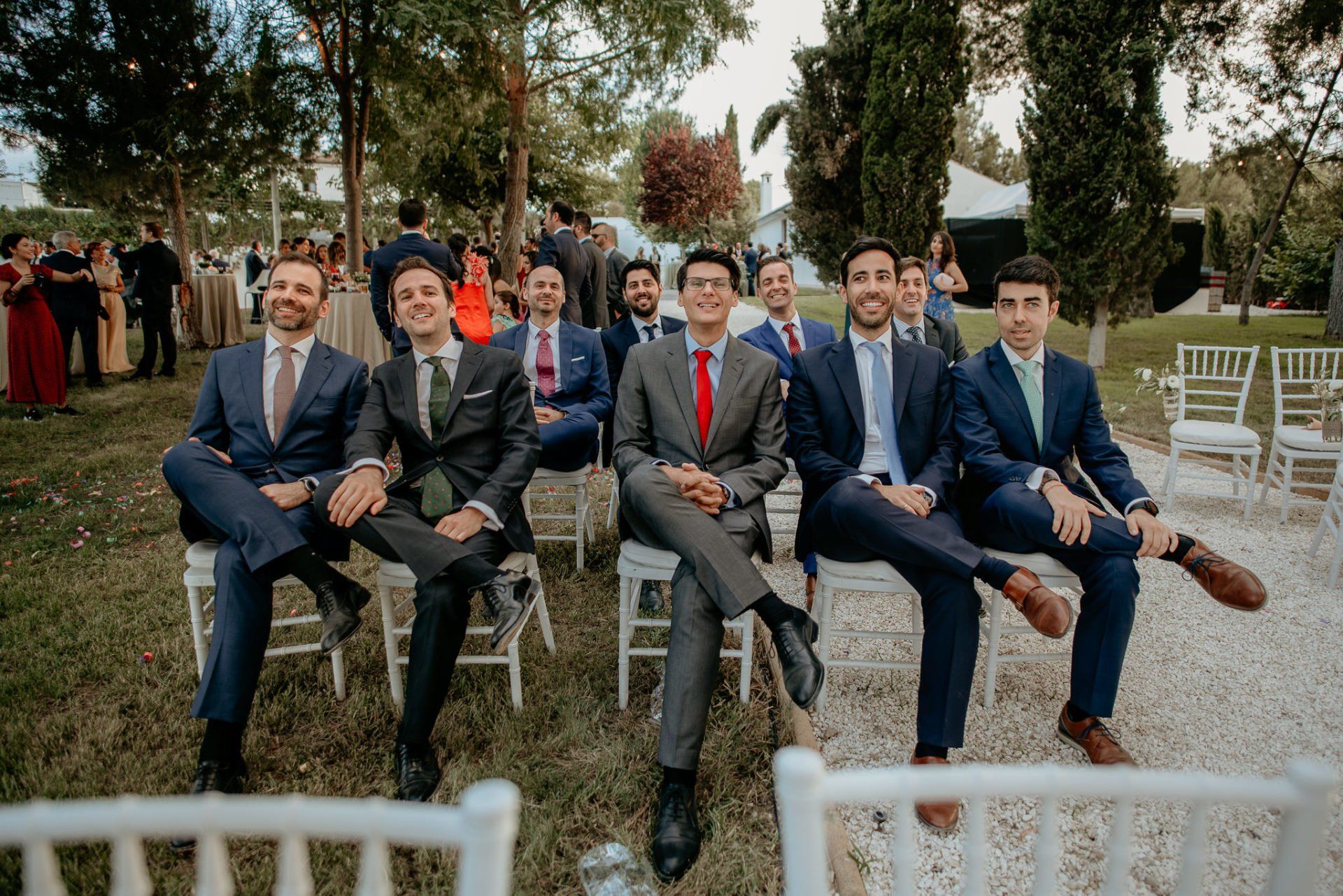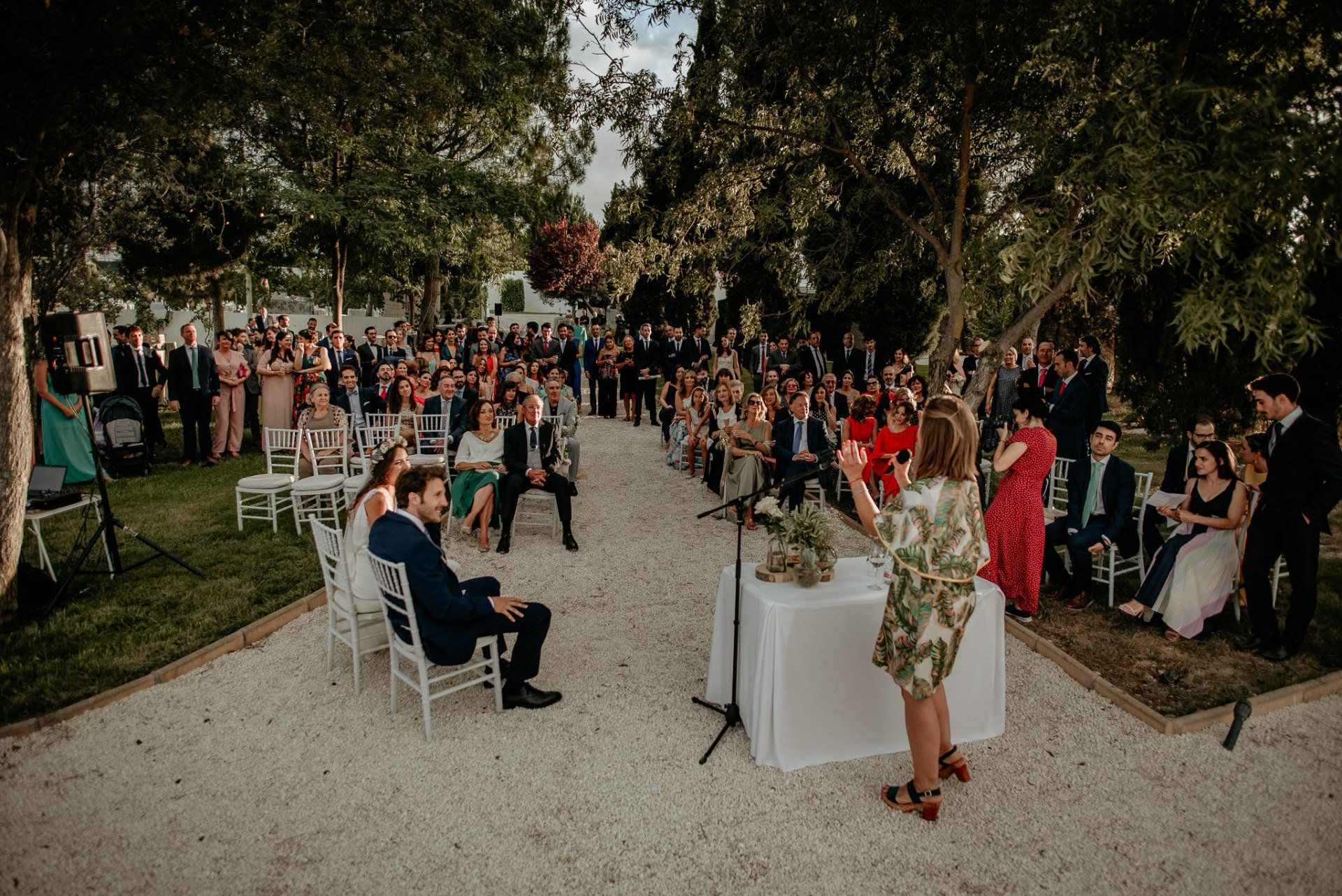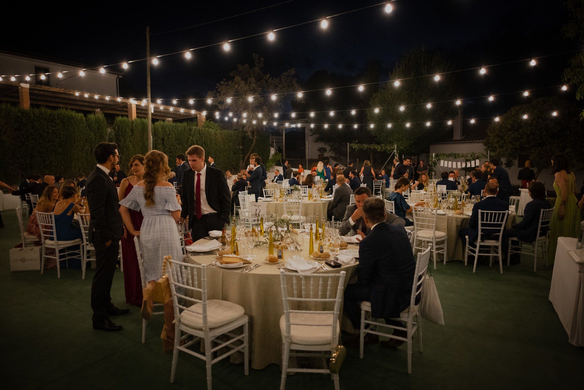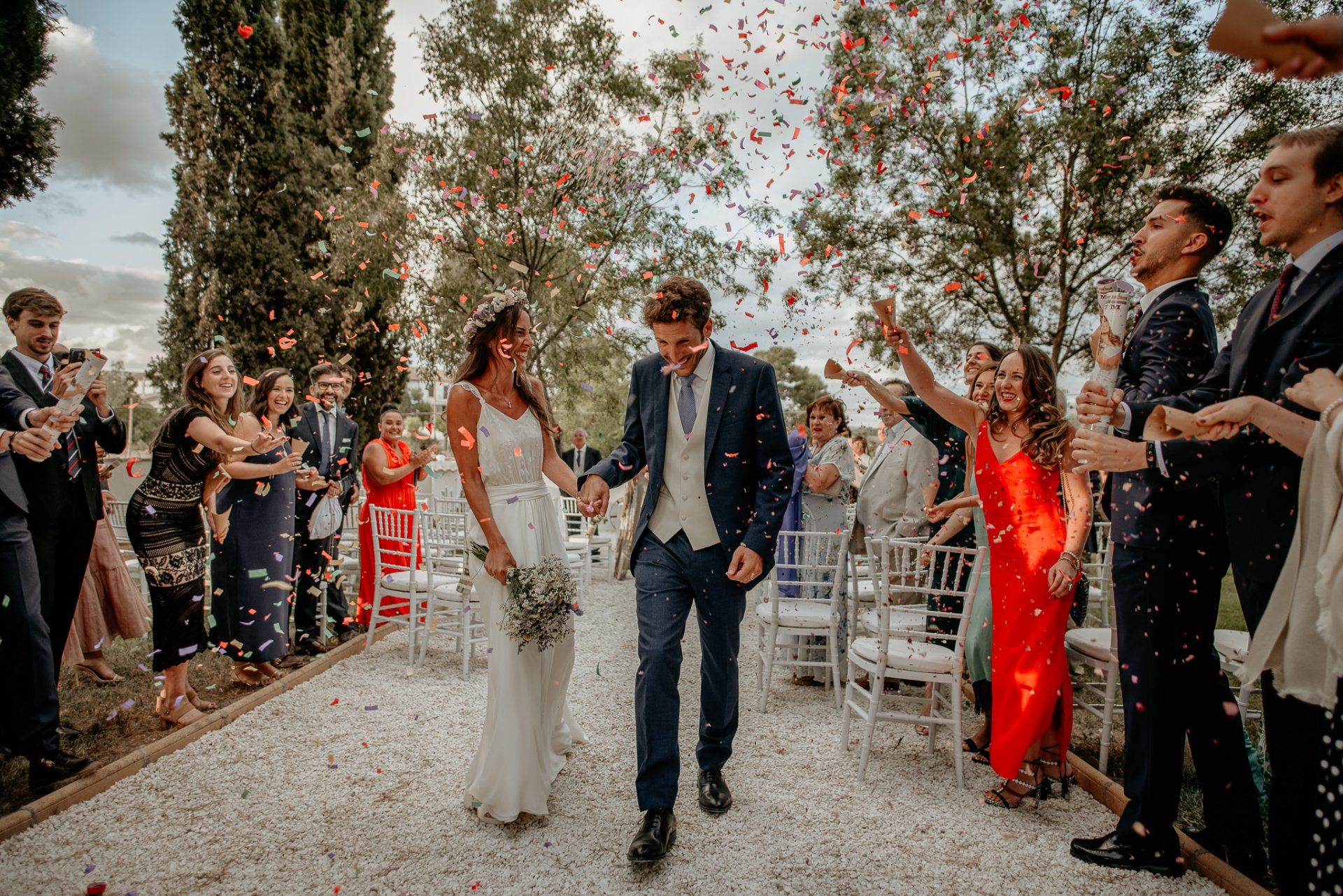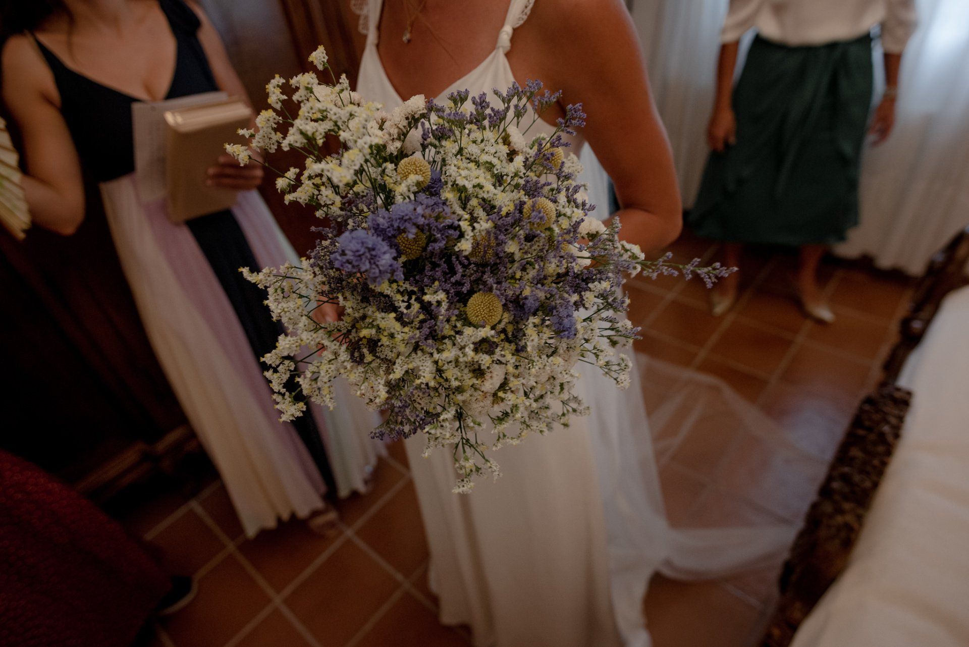 Álex und Elena reisten mit einem großen Gefolge aus Familie und Freunden aus Mallorca an, um ihre Hochzeit in Granada zu feiern. Obwohl ich nicht viel recherchierte, gab mir der Anblick einer asturischen Flagge auf der Schutzfolie des Mobiltelefons von Alex‘ Vater einen Hinweis auf deren Herkunft. Die Hochzeit fand auf der Farm von Elenas Familie in der Stadt Láchar in Granada statt. Ein andalusisches Anwesen mit zwei Hauptgebäuden mit Einfamilienhäusern, einem Waldgebiet, in dem die Zeremonie stattfand, und einem alten Tennisplatz, auf dem der Bankett- und Tanzbereich eingerichtet war. Wir beginnen am Alhambra Palace Hotel, an einem ganz besonderen Ort neben dem berühmtesten Denkmal und mit beneidenswertem Blick auf die Stadt. Elena zog sich auf dem Bauernhof Láchar an, wo sie auf Álex‘ Familie wartete. Die meisten Gäste, die von außerhalb kamen, hauptsächlich aus Mallorca und in der Stadt übernachteten, kamen in zwei Bussen an, die das Anwesen in einem Moment füllten. Die hochemotionale Zeremonie unter den Laubbäumen und geschützt vor Sonne und Hitze Ende Juli war eine Sammlung von Geschichten über das Paar in seinen Anfängen, den Anfängen seiner Beziehung, seinen Erasmus-Erlebnissen, seinen Reisen, seinen Jobs ... erzählt von den Menschen, die sie am besten kennen: Brüder und Abenteuerfreunde. Das spektakuläre Bankett und die Party im Tennisplatzbereich, zwischen den Herausforderungen und Streichen der zahlreichen Freunde. Es war beängstigend, als wir die Mädchen auf der einen und die Jungen auf der anderen Seite zum Fotografieren versammelten ... es konnte alles passieren. Wir waren so viele Stunden dort, dass wir keine Lust mehr hatten, von seiner Seite zu weichen.
