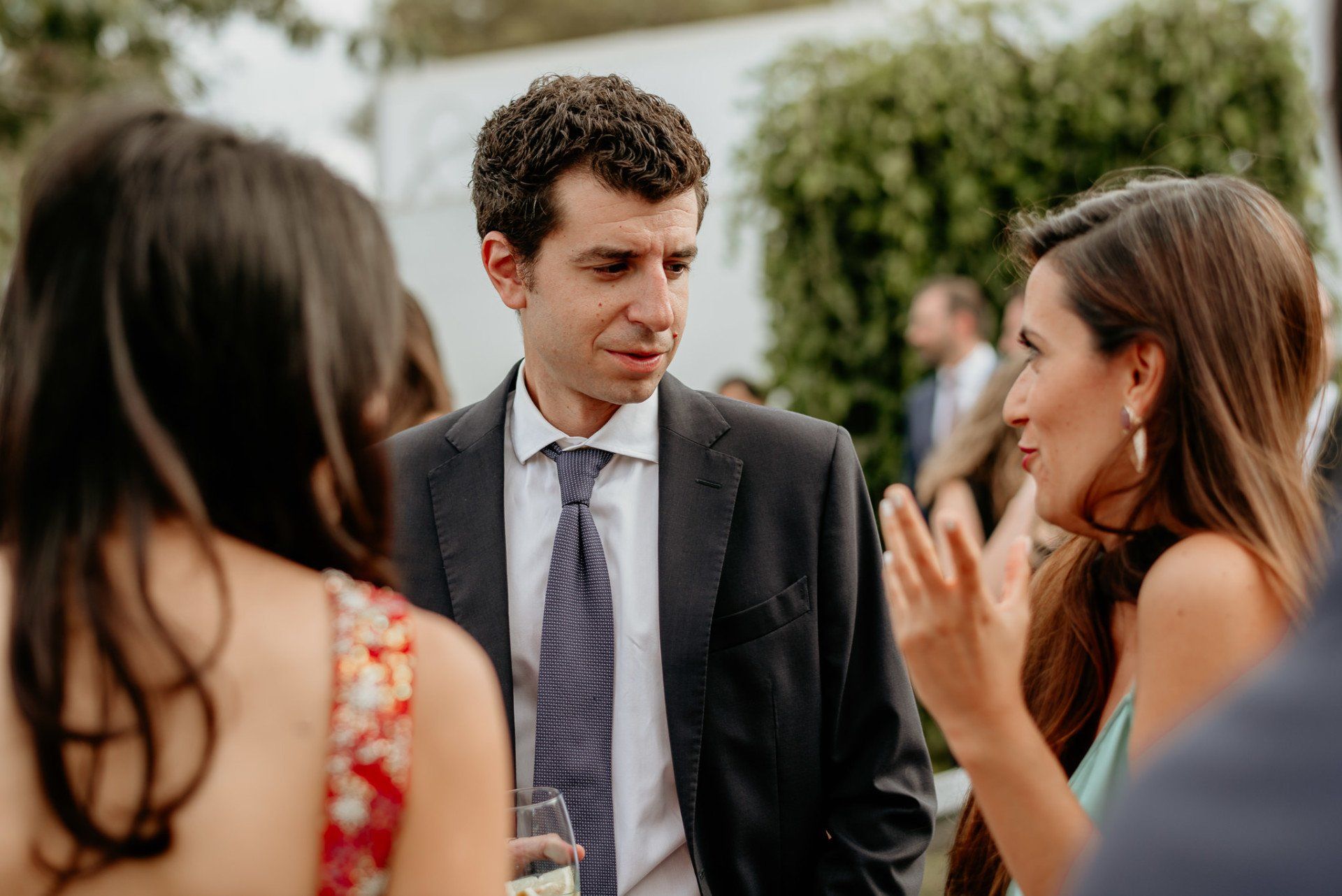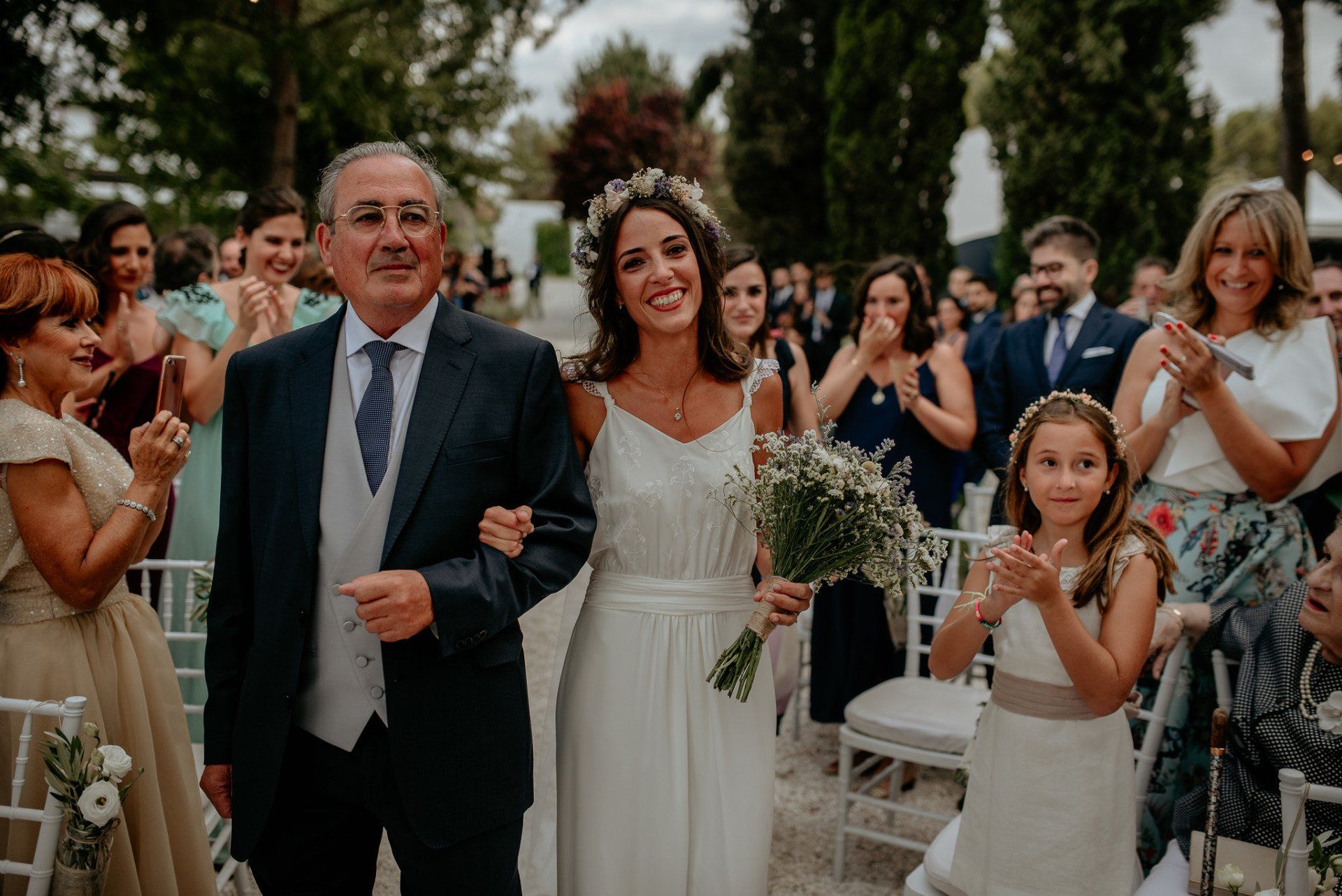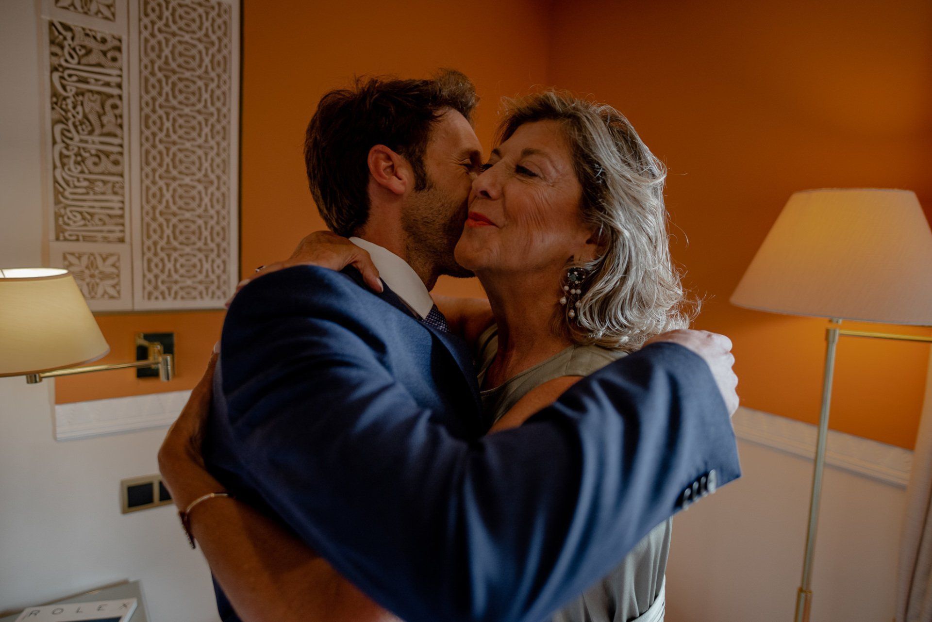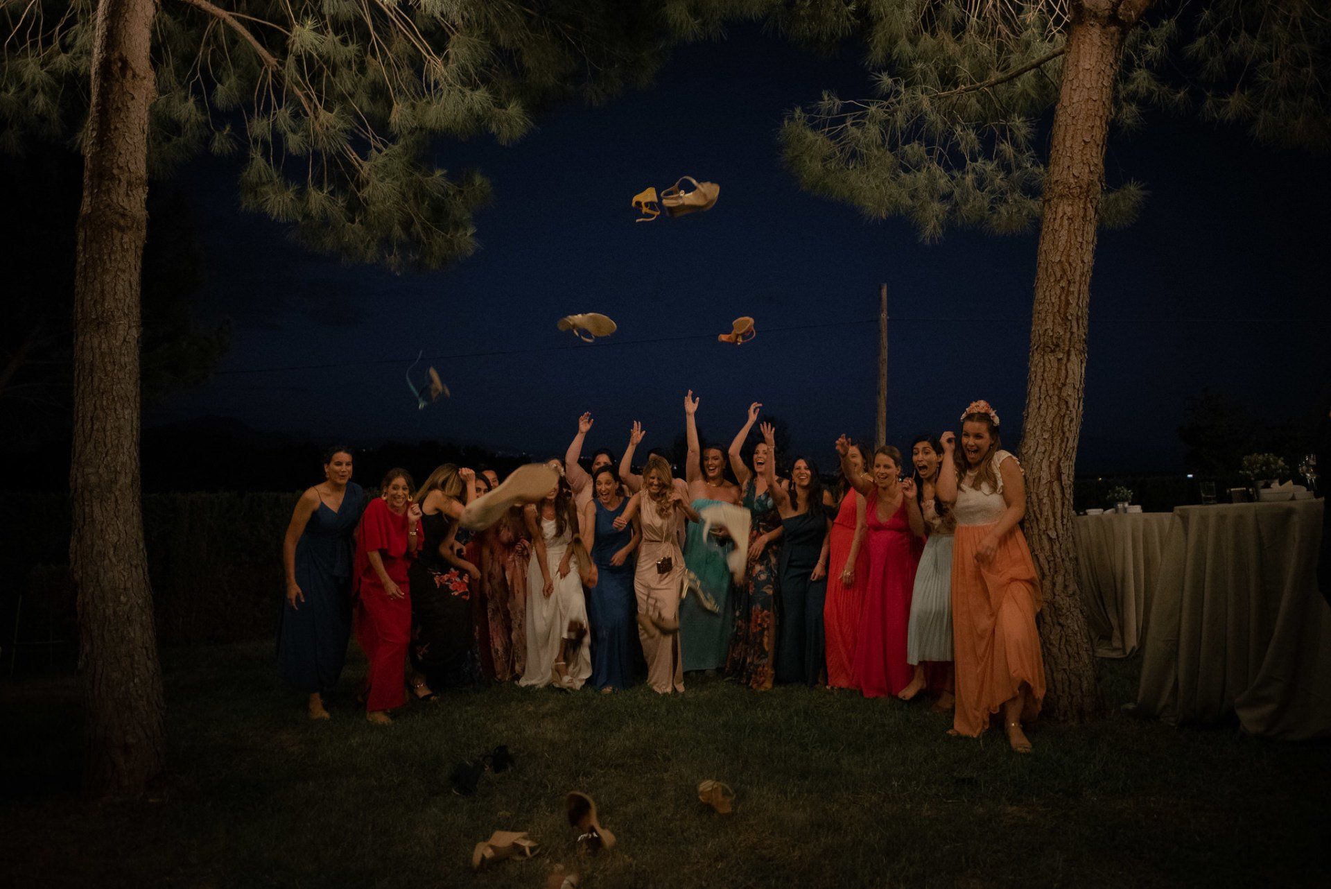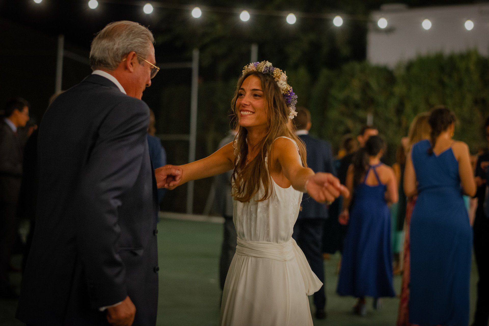 Álex und Elena reisten mit einem großen Gefolge aus Familie und Freunden aus Mallorca an, um ihre Hochzeit in Granada zu feiern. Obwohl ich nicht viel recherchierte, gab mir der Anblick einer asturischen Flagge auf der Schutzfolie des Mobiltelefons von Alex‘ Vater einen Hinweis auf deren Herkunft. Die Hochzeit fand auf der Farm von Elenas Familie in der Stadt Láchar in Granada statt. Ein andalusisches Anwesen mit zwei Hauptgebäuden mit Einfamilienhäusern, einem Waldgebiet, in dem die Zeremonie stattfand, und einem alten Tennisplatz, auf dem der Bankett- und Tanzbereich eingerichtet war. Wir beginnen am Alhambra Palace Hotel, an einem ganz besonderen Ort neben dem berühmtesten Denkmal und mit beneidenswertem Blick auf die Stadt. Elena zog sich auf dem Bauernhof Láchar an, wo sie auf Álex‘ Familie wartete. Die meisten Gäste, die von außerhalb kamen, hauptsächlich aus Mallorca und in der Stadt übernachteten, kamen in zwei Bussen an, die das Anwesen in einem Moment füllten. Die hochemotionale Zeremonie unter den Laubbäumen und geschützt vor Sonne und Hitze Ende Juli war eine Sammlung von Geschichten über das Paar in seinen Anfängen, den Anfängen seiner Beziehung, seinen Erasmus-Erlebnissen, seinen Reisen, seinen Jobs ... erzählt von den Menschen, die sie am besten kennen: Brüder und Abenteuerfreunde. Das spektakuläre Bankett und die Party im Tennisplatzbereich, zwischen den Herausforderungen und Streichen der zahlreichen Freunde. Es war beängstigend, als wir die Mädchen auf der einen und die Jungen auf der anderen Seite zum Fotografieren versammelten ... es konnte alles passieren. Wir waren so viele Stunden dort, dass wir keine Lust mehr hatten, von seiner Seite zu weichen.