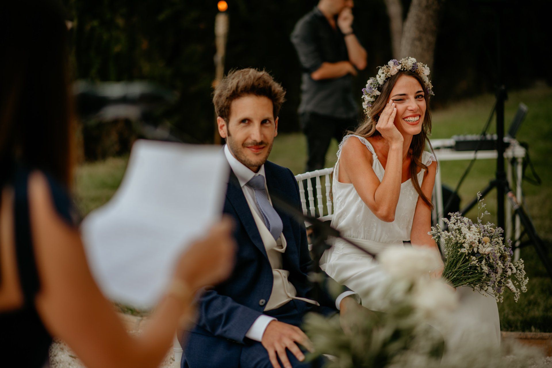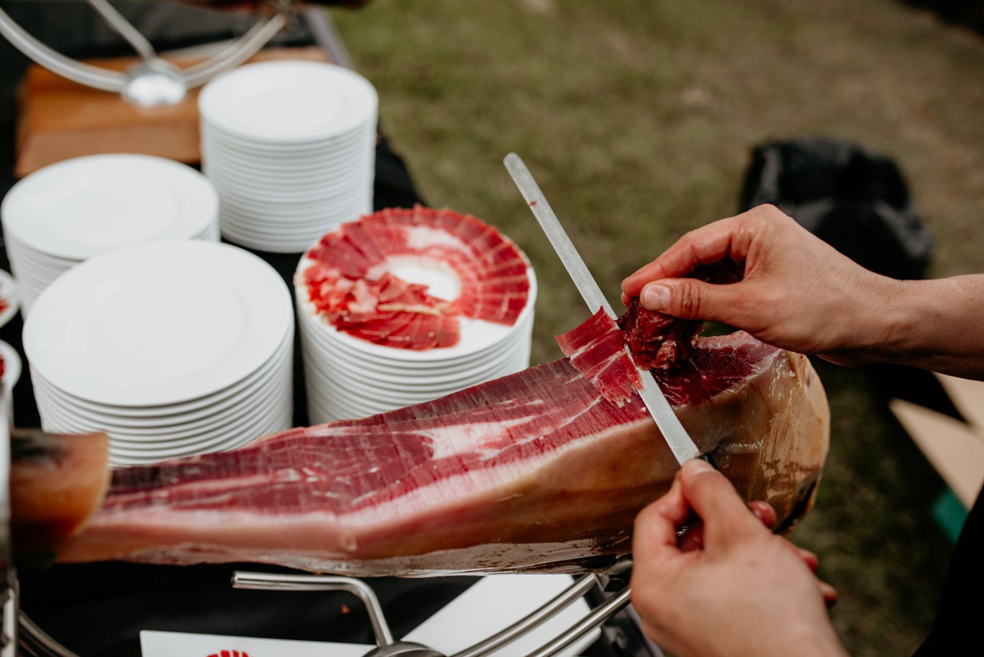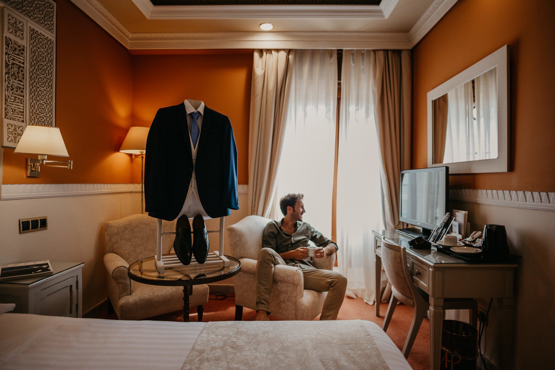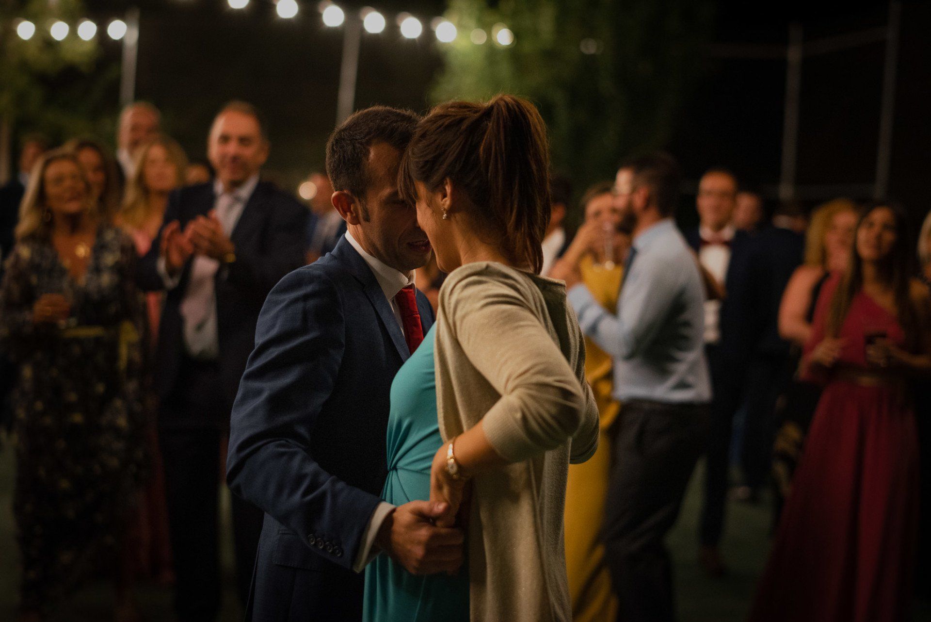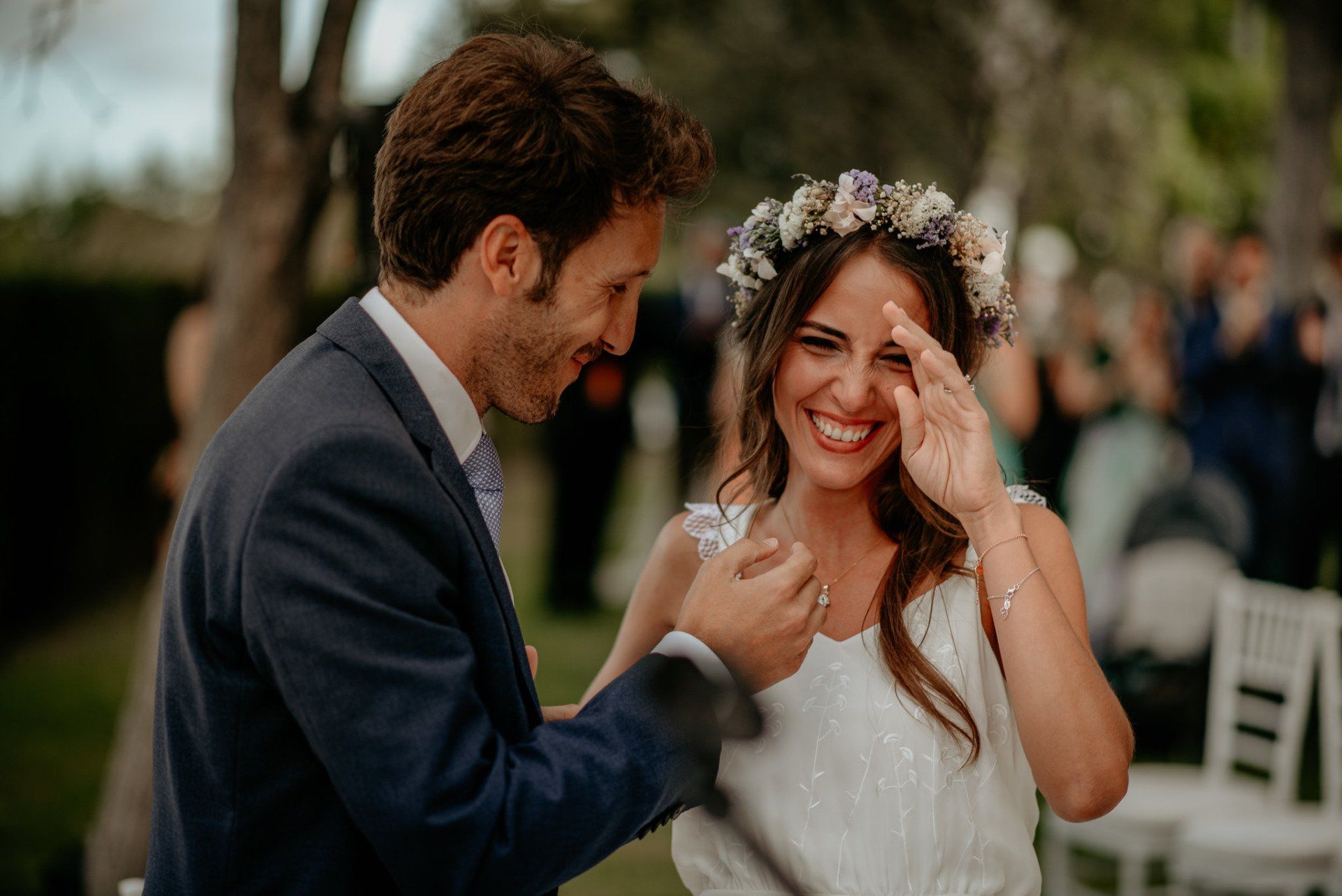 Álex und Elena reisten mit einem großen Gefolge aus Familie und Freunden aus Mallorca an, um ihre Hochzeit in Granada zu feiern. Obwohl ich nicht viel recherchierte, gab mir der Anblick einer asturischen Flagge auf der Schutzfolie des Mobiltelefons von Alex‘ Vater einen Hinweis auf deren Herkunft. Die Hochzeit fand auf der Farm von Elenas Familie in der Stadt Láchar in Granada statt. Ein andalusisches Anwesen mit zwei Hauptgebäuden mit Einfamilienhäusern, einem Waldgebiet, in dem die Zeremonie stattfand, und einem alten Tennisplatz, auf dem der Bankett- und Tanzbereich eingerichtet war. Wir beginnen am Alhambra Palace Hotel, an einem ganz besonderen Ort neben dem berühmtesten Denkmal und mit beneidenswertem Blick auf die Stadt. Elena zog sich auf dem Bauernhof Láchar an, wo sie auf Álex‘ Familie wartete. Die meisten Gäste, die von außerhalb kamen, hauptsächlich aus Mallorca und in der Stadt übernachteten, kamen in zwei Bussen an, die das Anwesen in einem Moment füllten. Die hochemotionale Zeremonie unter den Laubbäumen und geschützt vor Sonne und Hitze Ende Juli war eine Sammlung von Geschichten über das Paar in seinen Anfängen, den Anfängen seiner Beziehung, seinen Erasmus-Erlebnissen, seinen Reisen, seinen Jobs ... erzählt von den Menschen, die sie am besten kennen: Brüder und Abenteuerfreunde. Das spektakuläre Bankett und die Party im Tennisplatzbereich, zwischen den Herausforderungen und Streichen der zahlreichen Freunde. Es war beängstigend, als wir die Mädchen auf der einen und die Jungen auf der anderen Seite zum Fotografieren versammelten ... es konnte alles passieren. Wir waren so viele Stunden dort, dass wir keine Lust mehr hatten, von seiner Seite zu weichen.