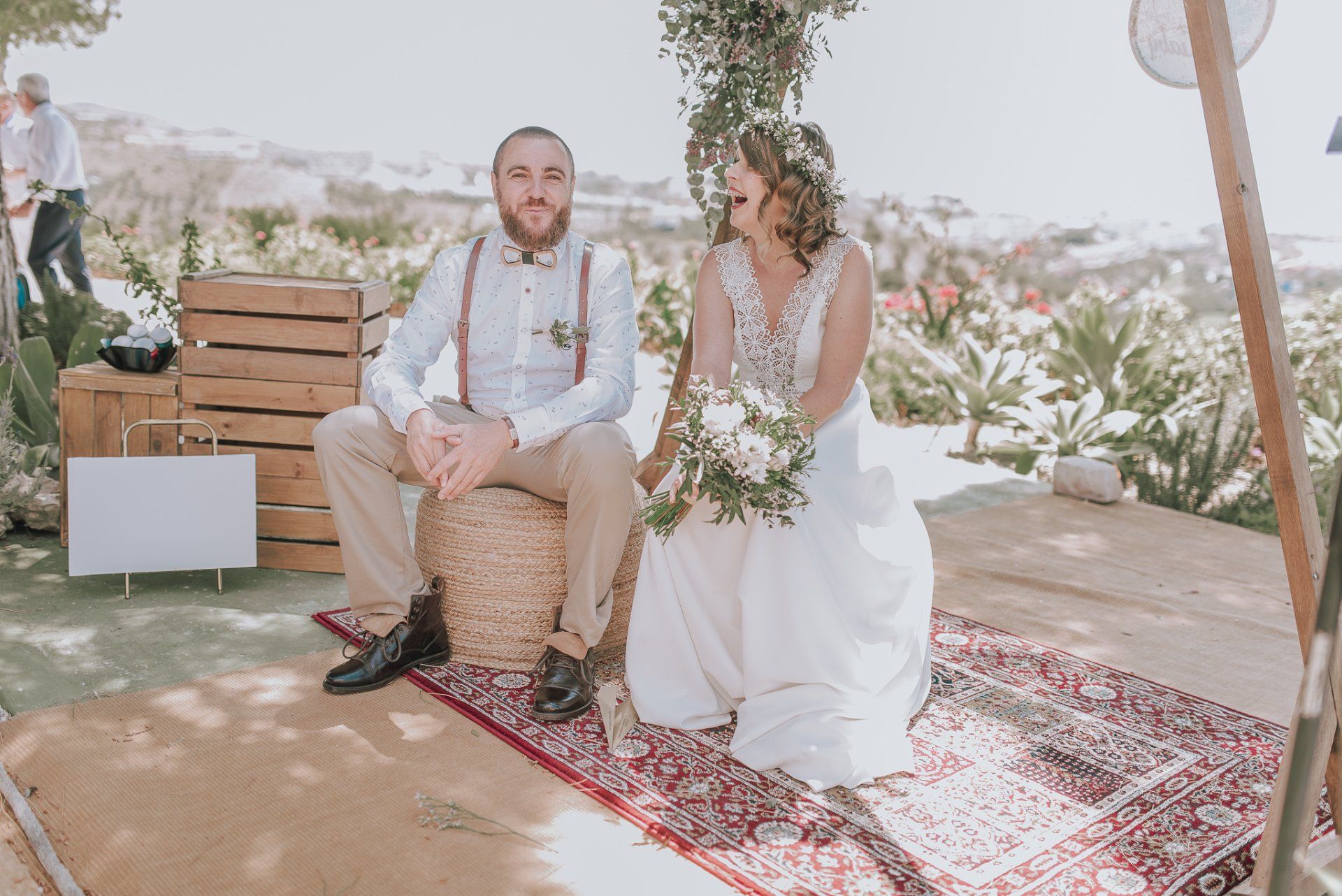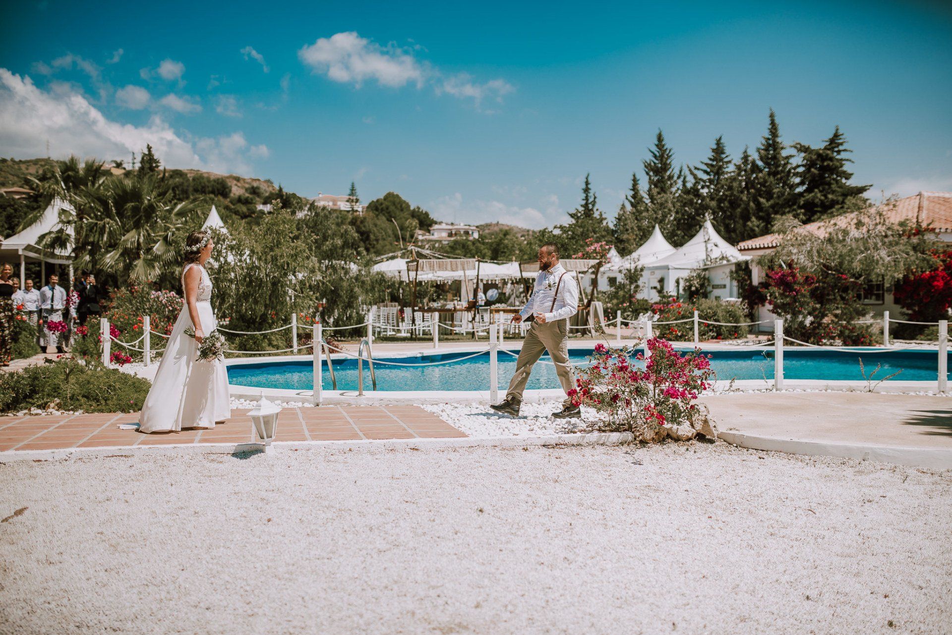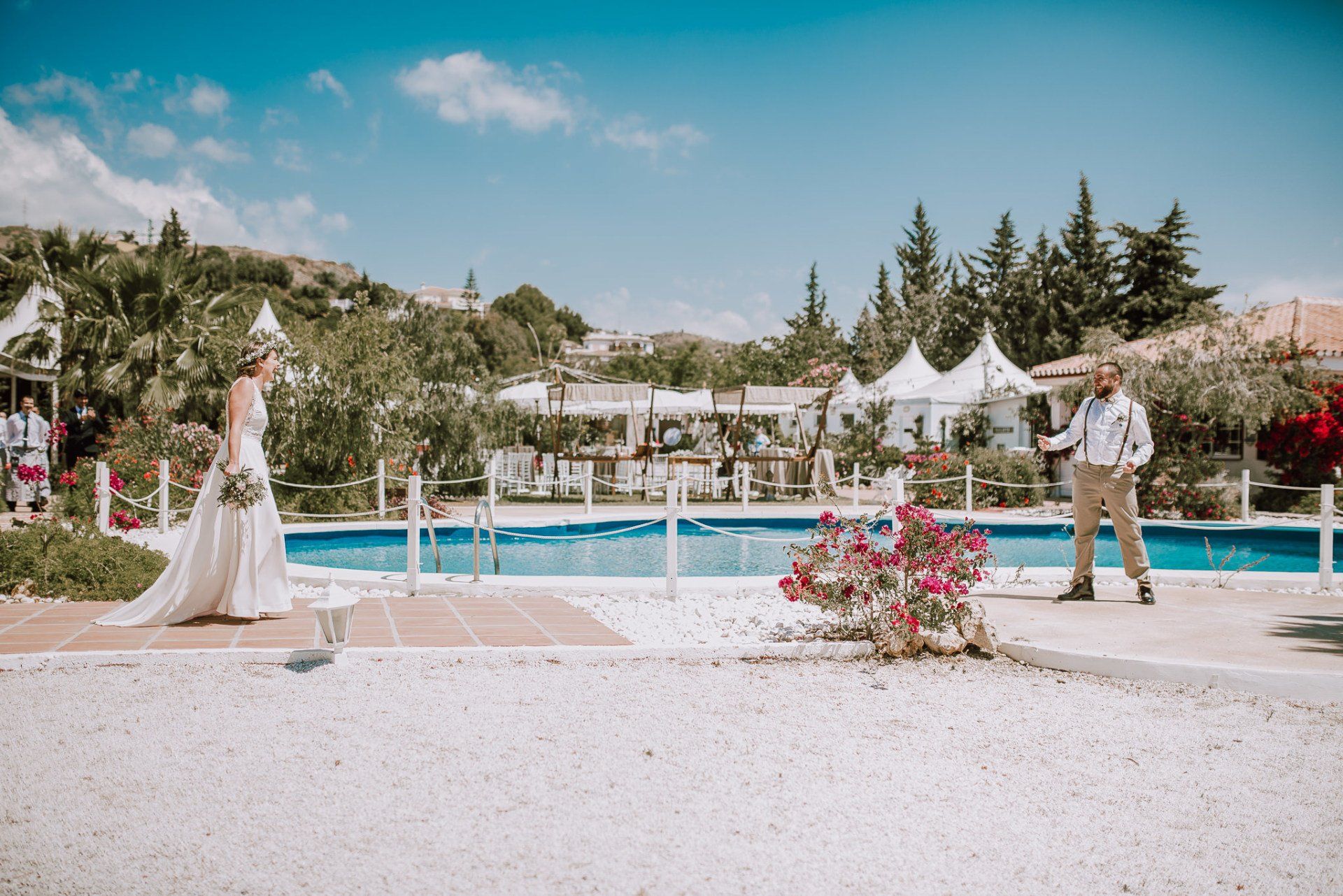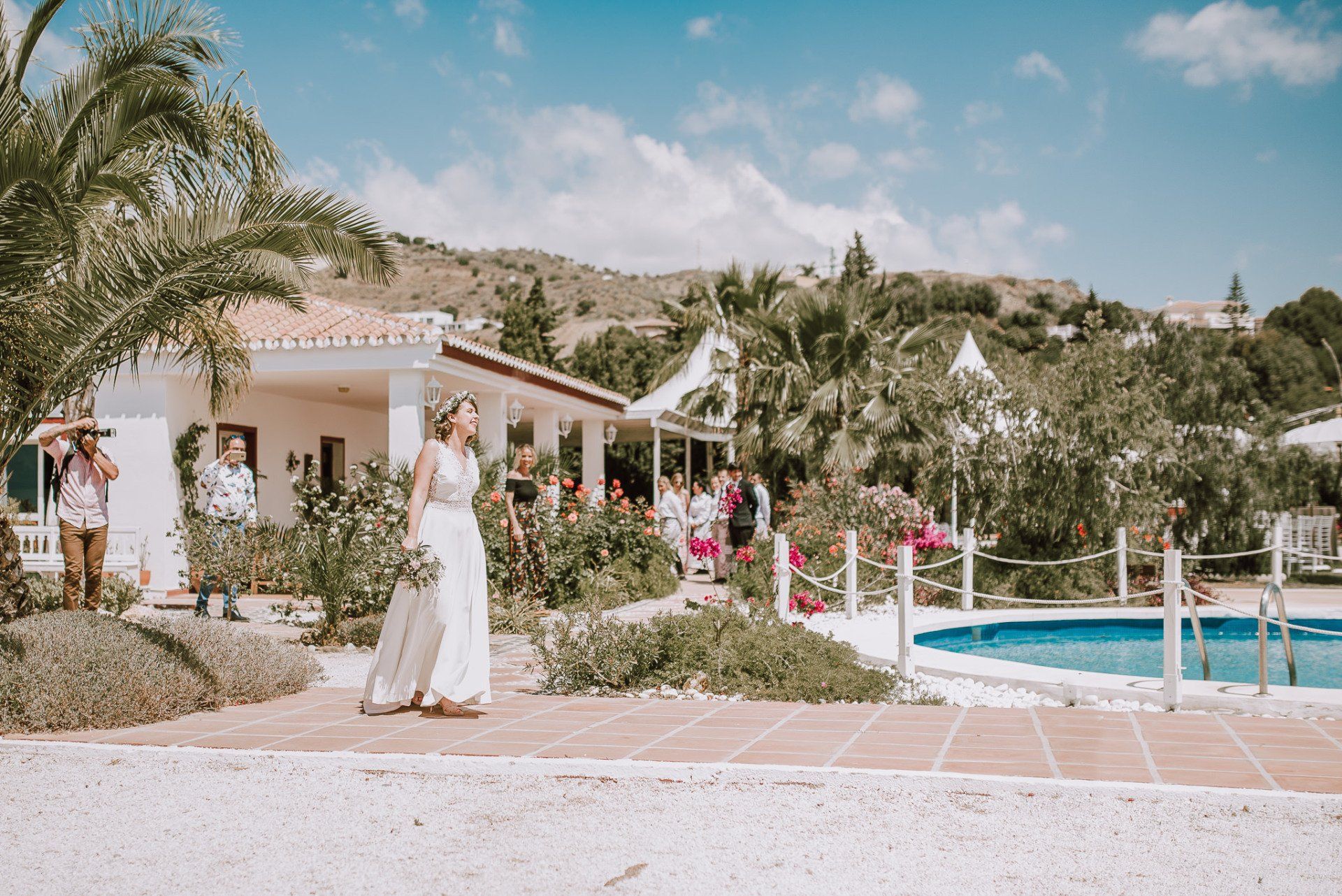 (ver web), regentada por ALMA Catering (ver web), es un lugar muy adecuado para realizar todo el evento de la boda de principio a fin. Cuenta con dos apartamentos (con una piscina no utilizable por los asistentes -una pena-) donde los novios pueden quedarse y prepararse par la ceremonia, con lo que se facilita mucho el tema desplazamientos y nos hace el trabajo más fácil a los fotógrafos. La ceremonia, en el lateral de la finca, bajo enormes árboles y con unas generosas vistas al mar, una decoración minimalista y algo rústica, y la zona de comida delante de la piscina en una amplia zona de césped y en plan informal, con estilo showcooking y estaciones de cocinas del mundo: mexicana, marroquí, japones, thai y hasta unos espetos de sardinas malagueñas para unos invitados de varios países y varias zonas de la geografía española.