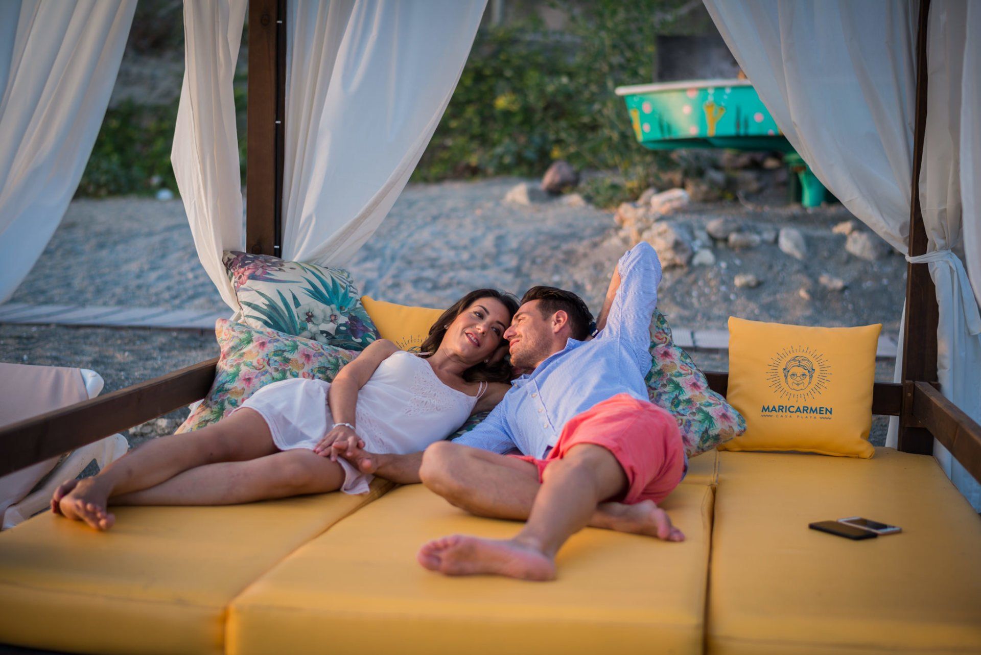 con sus camas enormes su banco de madera frente al mar con su frase pintada en el respaldo de "te quiero" que nos venía al pelo.