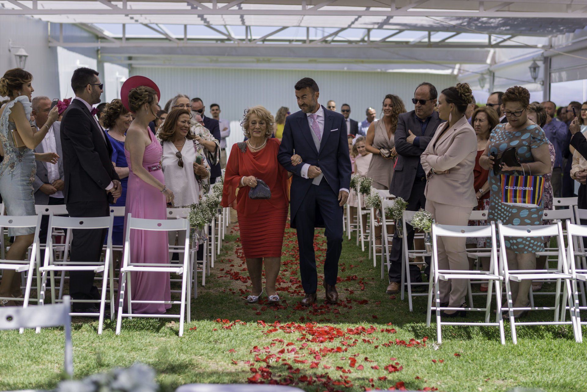 Así, comenzamos nuestro trabajo el mismo día de la boda un poco antes de la ceremonia en Finca Chalet El Rocío, una gran parcela ajardinada con unas amplias extensiones de césped muy bien cuidado y árboles importantes, de esos que se les nota una gran edad y que dan sombra precisa para estos días de calor. Una coqueta piscina con un puente de madera en el centro en el que nos hicimos algunas fotillos de grupo bastante graciosas. Una carpa específica para la ceremonia y otra mayor en la zona inferior, al final de la finca para el banquete y la barra libre.