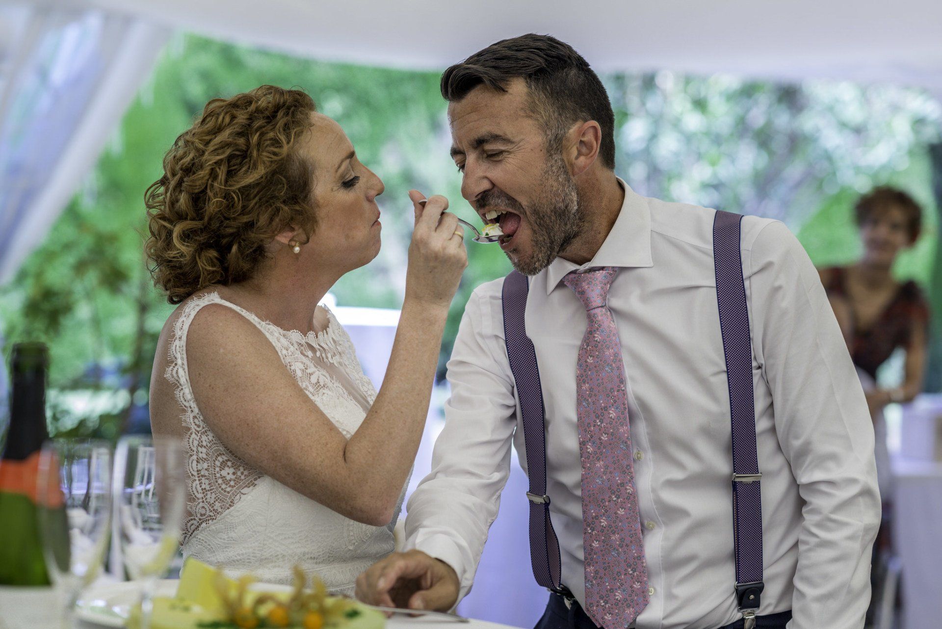 En la carpa grande, con las lonas laterales quitadas por completo por el calor a esa hora, pasamos a la comida y el resto de celebración. La luz era bastante buena para el desarrollo de nuestro trabajo y los invitados desde el primer momento empezaron a darlo todo. Hablando de invitados, una de las parejas asistentes, unos de los mejores amigos de los novios, habían sido compañeros de trabajo mío años atrás; imaginad la sorpresa cuando nos encontramos en el cóctel.