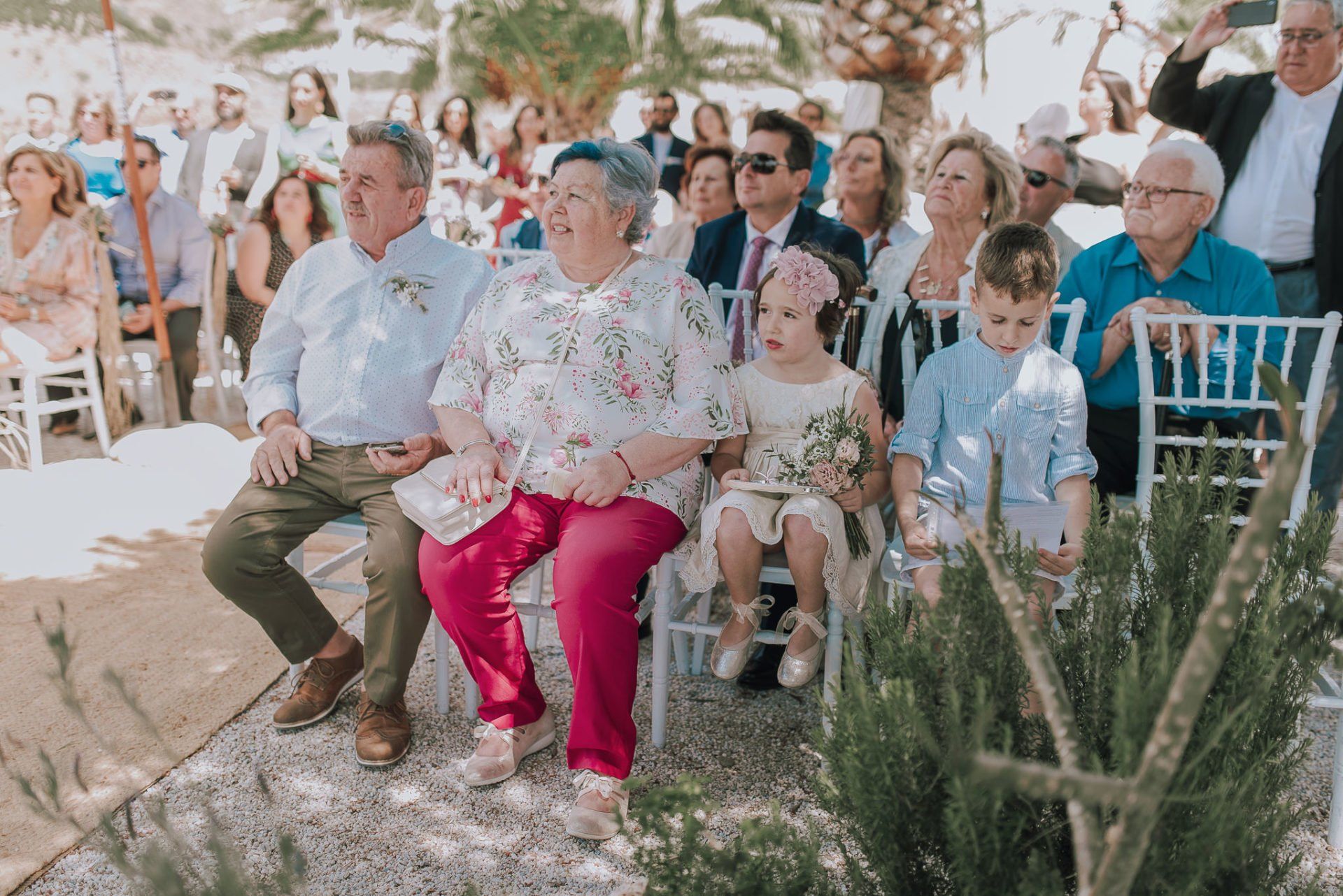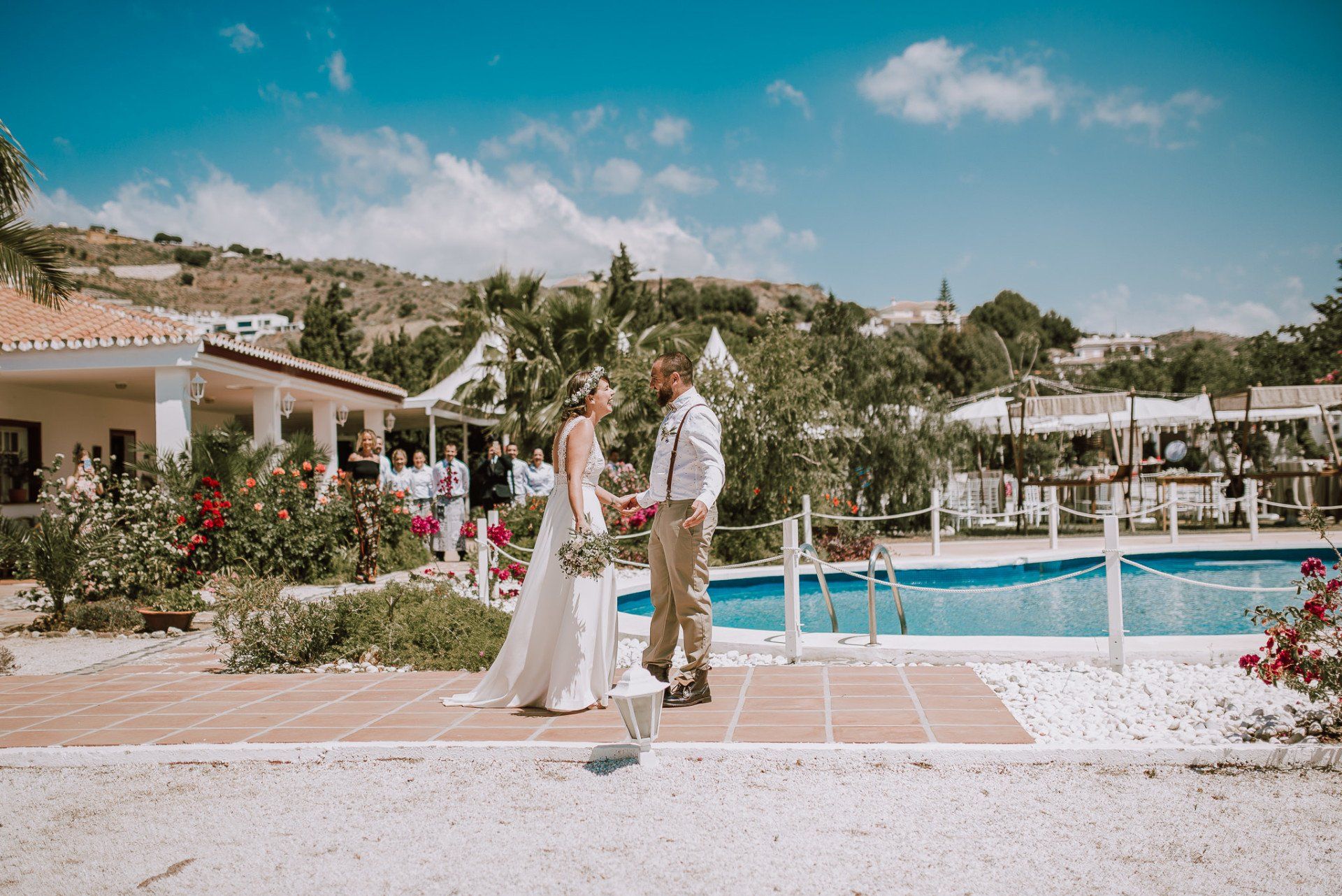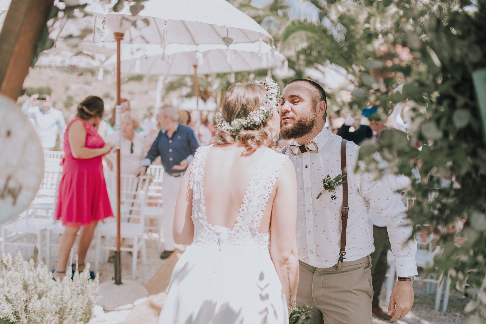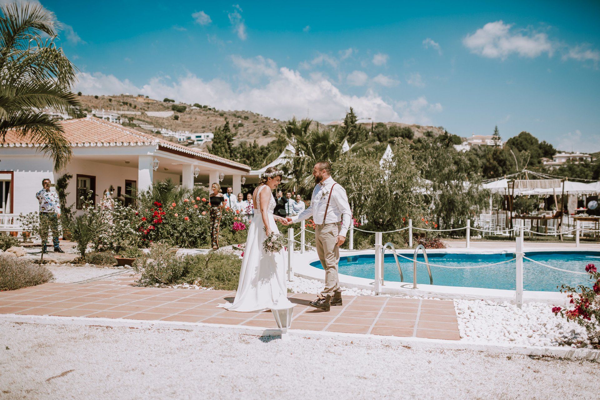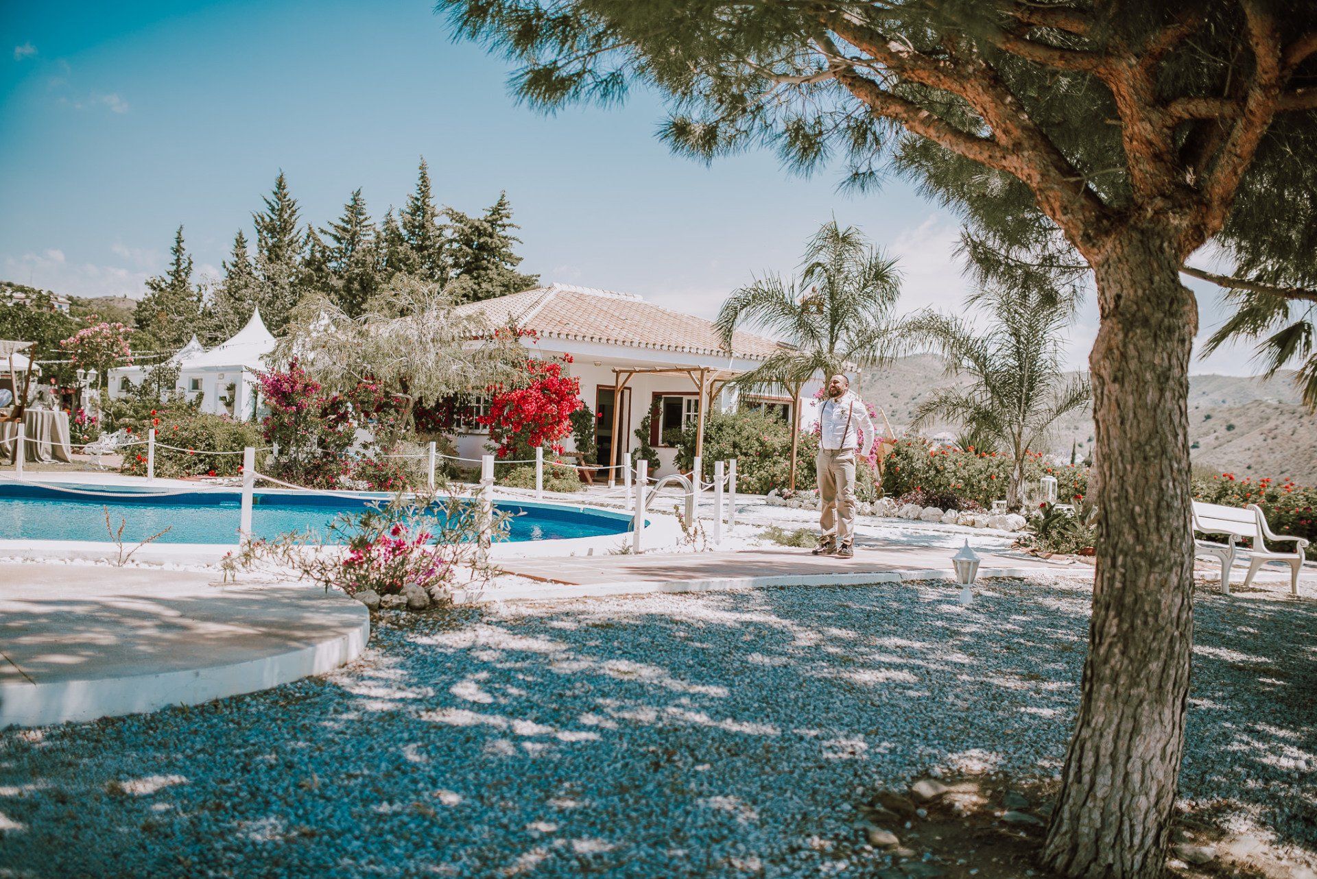 (ver web), regentada por ALMA Catering (ver web), es un lugar muy adecuado para realizar todo el evento de la boda de principio a fin. Cuenta con dos apartamentos (con una piscina no utilizable por los asistentes -una pena-) donde los novios pueden quedarse y prepararse par la ceremonia, con lo que se facilita mucho el tema desplazamientos y nos hace el trabajo más fácil a los fotógrafos. La ceremonia, en el lateral de la finca, bajo enormes árboles y con unas generosas vistas al mar, una decoración minimalista y algo rústica, y la zona de comida delante de la piscina en una amplia zona de césped y en plan informal, con estilo showcooking y estaciones de cocinas del mundo: mexicana, marroquí, japones, thai y hasta unos espetos de sardinas malagueñas para unos invitados de varios países y varias zonas de la geografía española.